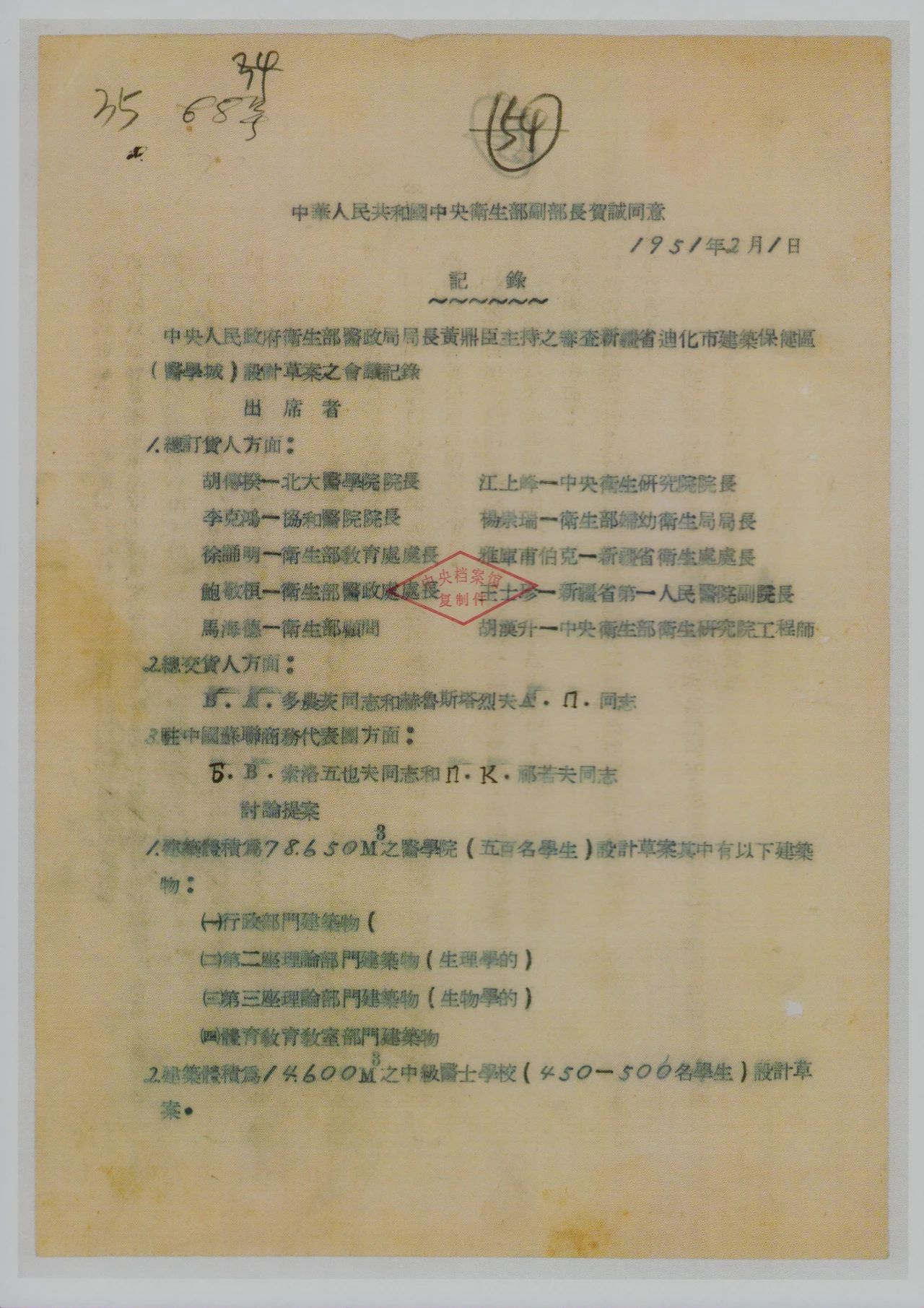 这是一份来自中央档案馆的珍贵史料1951年2月1日中央卫生部召开审查“新疆医学城”设计草案的会议审查并同意了新疆省迪化市建筑保健区(医学城)设计草案参会人员均为当时中国顶尖的医学教育专家、工程设计专家以及苏联专家