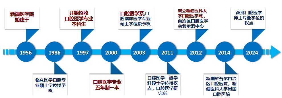 1986年获批口腔科学(口腔颌面外科学)硕士学位授予点,1997年开始招收口腔医学本科生,2000年招收五年制本科口腔医学专业,2003年获批口腔医学硕士专业学位授权点,2011年获批口腔医学一级学科硕士学位授权点,2024年获批口腔医学博士专业学位授权点。是新疆唯一一所承担口腔医学本科、硕士及博士研究生培养的教育机构,在医、教、研、预防、培训等方面均起到示范作用。20余年来培养2000余名毕业生,80%扎根新疆,为新疆医疗卫生事业的发展做出了突出贡献。
