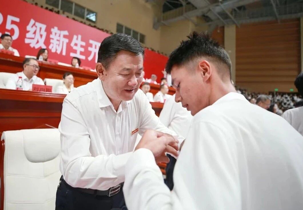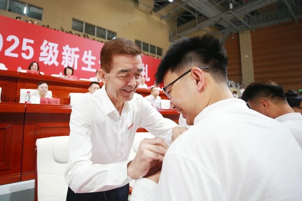 庄重而温暖的校徽佩戴环节,校领导逐一为新生代表佩戴上熠熠生辉的新疆医科大学校徽。这枚小小的校徽,不仅是身份的象征,更是一份沉甸甸的责任与使命的传递。