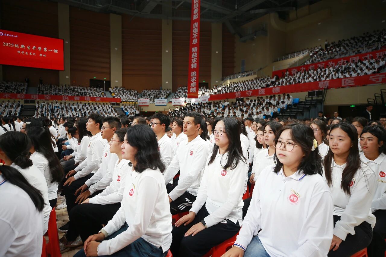 全体在校领导、各职能处室、各学院、各附属医院副处级及以上干部,各学院教师代表,学工队伍及2025级全体新生参加了开学典礼。
