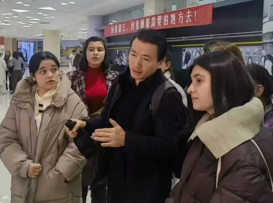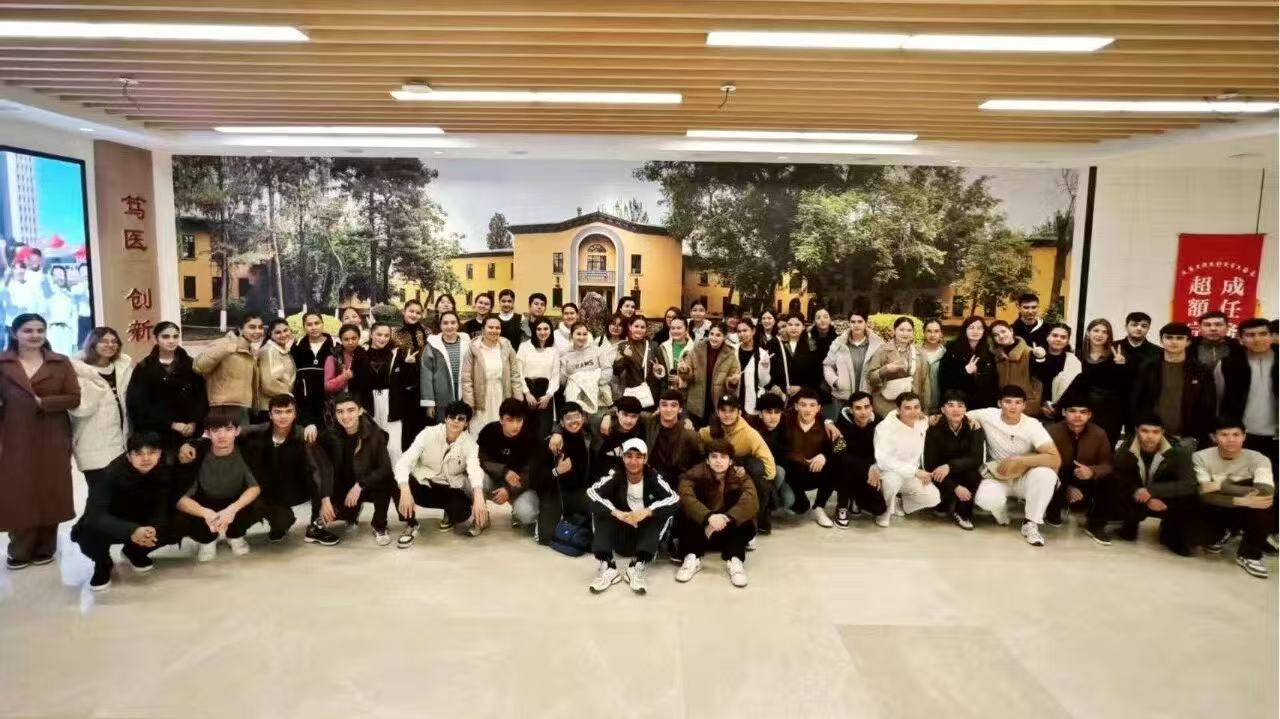 在校史专题展厅,留学生们走进新医厚重的历史记忆,感受学校扎根边疆、服务健康的使命传承。