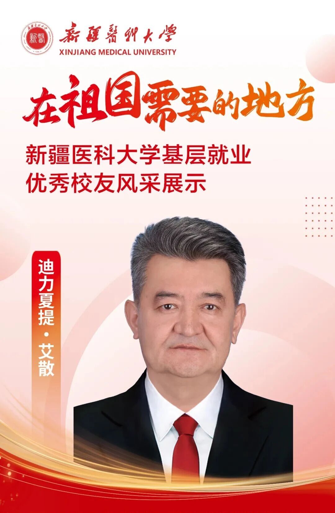 答案,往往书写在祖国最需要的地方。自建校之初,一代代新医人把个人理想融入国家命运,响应祖国号召,扎根边疆、护佑生命,这份初心如星火燎原,成为照亮新医人永不褪色的精神底色。基层,是砥砺初心的最好课堂,是施展才华的广阔舞台,呼唤着青春的智慧与力量,也必将成就人生的梦想与价值。为唱响“到祖国最需要的地方去”的青春强音,新疆医科大学官微特别推出三期《新医优秀校友的“基层答卷”》系列专题,为您讲述我校24位优秀校友扎根基层、服务人民、奉献青春的动人故事。从救死扶伤的一线,到乡村振兴的前沿,他们赓续着新医的红色血脉,把论文写在大漠边疆,把手术台搭在雪山脚下,将仁心仁术深深镌刻在天山南北,用实际行动浇灌出最美的民族团结之花。他们的选择,是对青春价值的最佳诠释;他们的奋斗,是对报国誓言的最美践行。让我们一同走进这些平凡而伟大的身影,汲取前行的榜样力量!