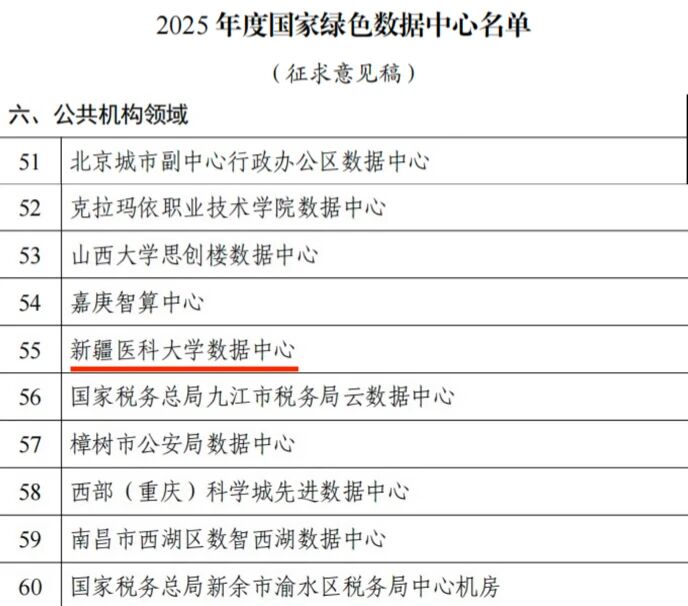 近日,工信部联合国家发改委、商务部、金融监管总局、国管局及国家能源局发布了2025年度国家绿色数据中心名单,新疆医科大学数据中心成功入选,这是新疆公共机构首次获此殊荣。