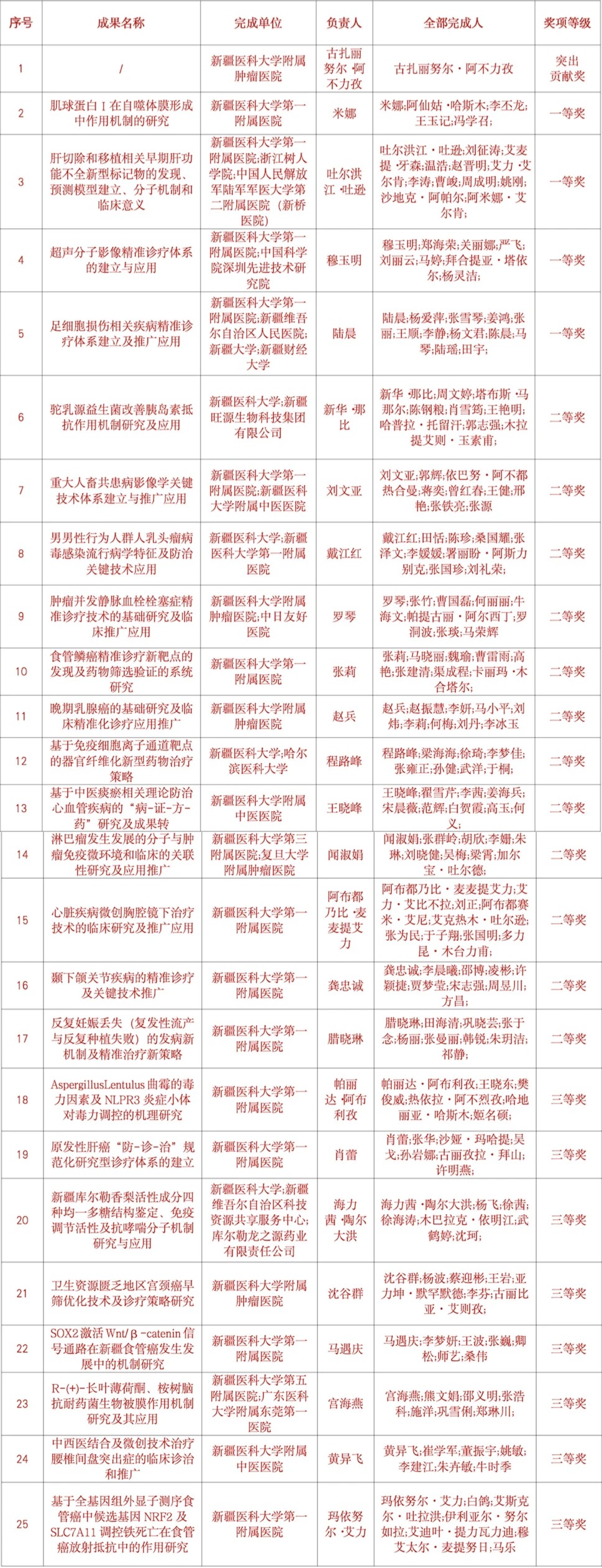 11月17日召开的自治区科技创新大会,对获得2024年度自治区科学技术突出贡献奖的5位科学家、149项自治区科学技术奖获奖成果进行了表彰。新疆医科大学作为第一完成单位荣获2024年度自治区科学技术奖25项。其中,突出贡献奖1项、一等奖4项(自然科学奖1项,科技进步奖3项)、二等奖12项、三等奖8项,获奖总数创学校历史新高,占自治区获奖总数的16.23%。