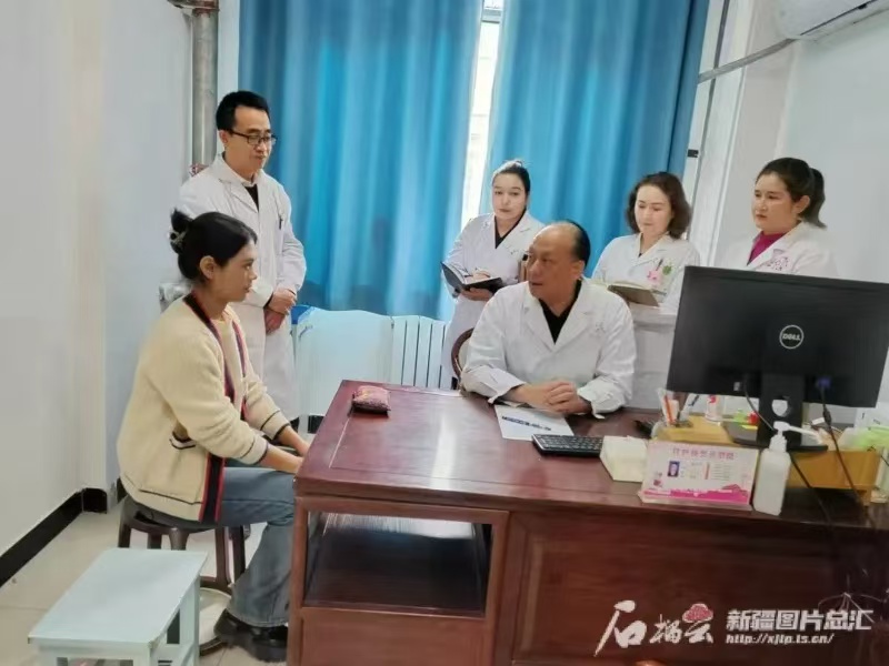 2024年12月22日,新疆医科大学第一附属医院支援墨玉县人民医院院长李华贵在中医科门诊为前来就诊的患者问诊把脉。新疆医科大学第一附属医院供图