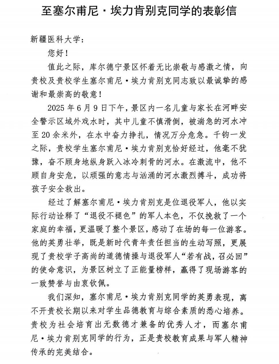 塞尔甫尼・埃力肯别克的行为得到了景区管理部门的高度赞扬,景区特地向我校全科医学学院发来了感谢信,对塞尔甫尼・埃力肯别克的英勇事迹表示肯定与感谢。同时,在现场游客中也引起了强烈反响,大家纷纷为他的英勇之举点赞。