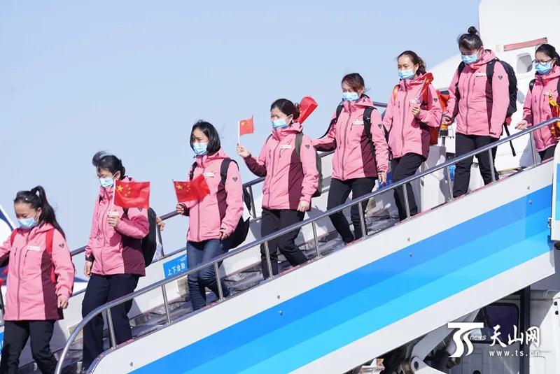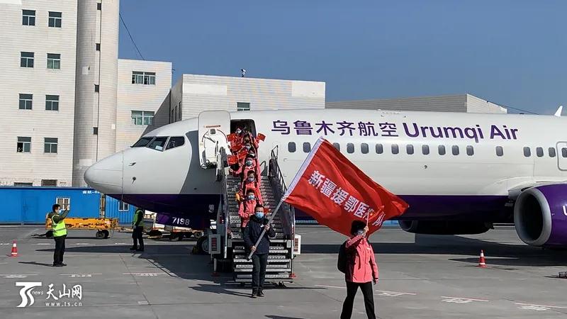 新疆第一批支援湖北医疗队队员依次走下飞机。
