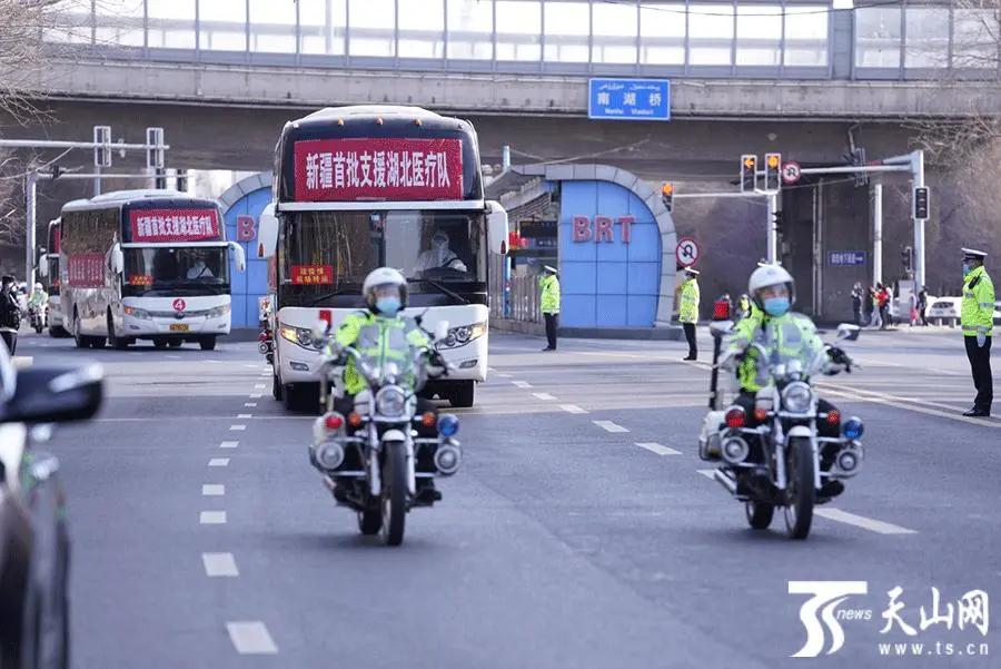 武汉当地警车护送新疆第一批支援湖北医疗队前往机场