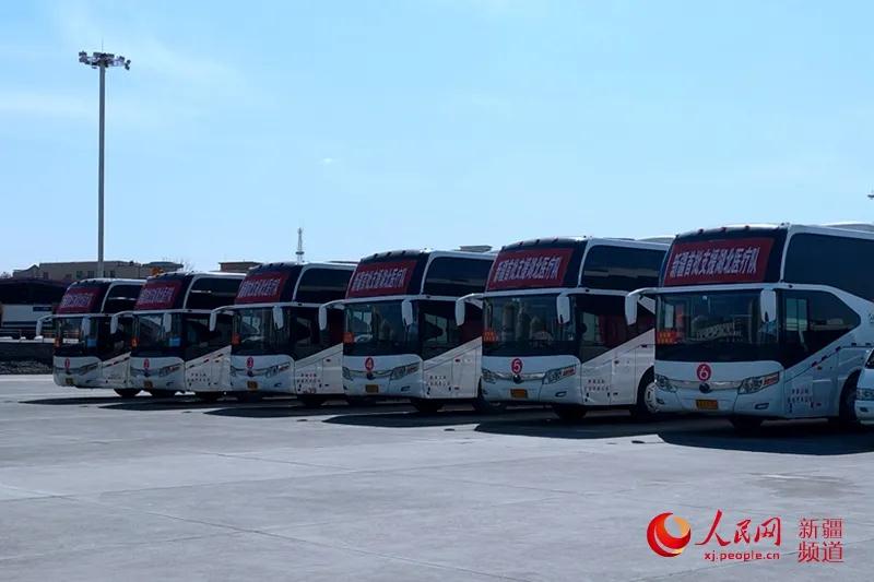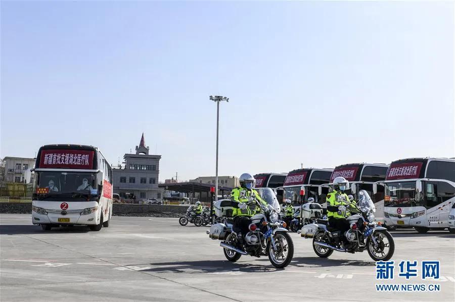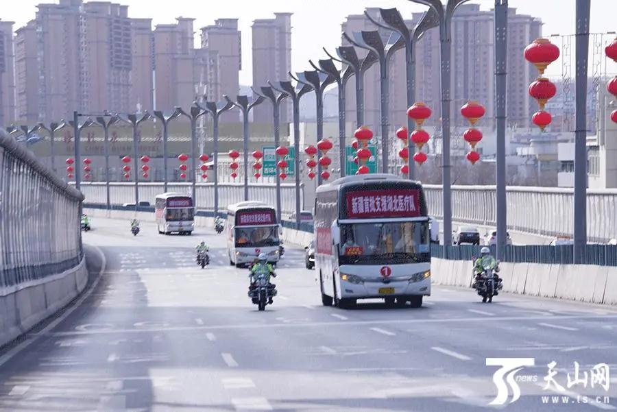 新疆首批支援湖北医疗队队员乘坐大巴车离开乌鲁木齐地窝堡国际机场。