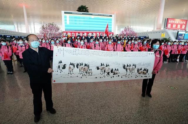 前来送行的省委统战部、新疆驻湖北工作组有关负责人为医疗队送来纪念品,是由省文联民间文艺家协会会员、国家高级工艺美术师容正茂连夜完成的字画,每幅作品上都绘有一个象形“鼠”字,队员们每人一套。