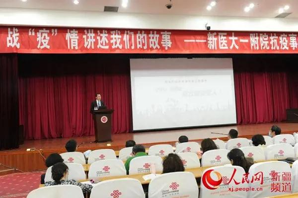 新疆医科大学第一附属医院的党员、职工听取五位逆行者代表的战疫故事。