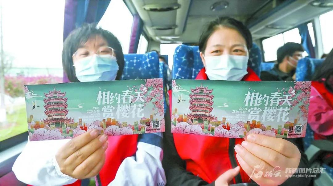 3月13日,武汉大学开辟“抗疫医护赏樱专场”,如约邀请近千名支援武汉大学人民医院东院和武昌方舱医院的外省医护赏樱。时隔一年,新疆医护代表抵达曾经战斗过的英雄城市——武汉。他们以家人的身份回家省亲,眼中的樱花格外绚烂。