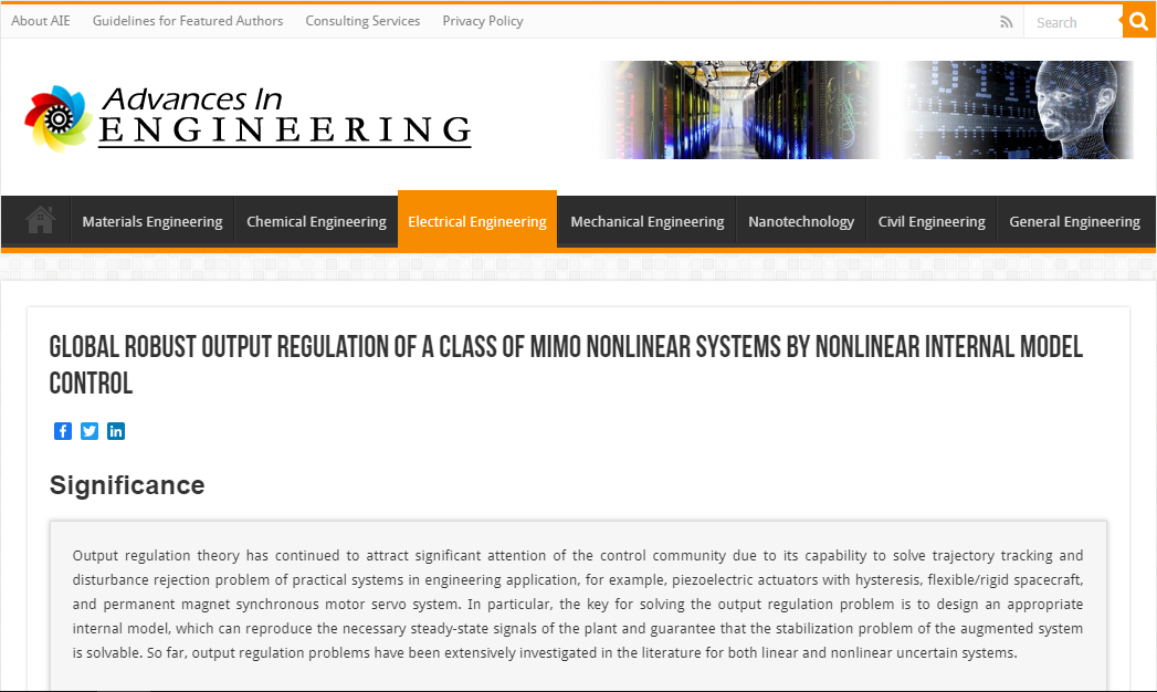 2021年12月,我院平兆武教授课题组发表在控制领域著名期刊《International Journal of Robust and Nonlinear control》的研究论文被国际著名工程学科技机构“Advances In Engineering”(简称AIE)遴选为关键科学文章(a key scientific article),并以“Global robust output regulation of a class of MIMO nonlinear systems by nonlinear internal model control”为题在电气工程(Electrical Engineering)栏目进行专题报道。