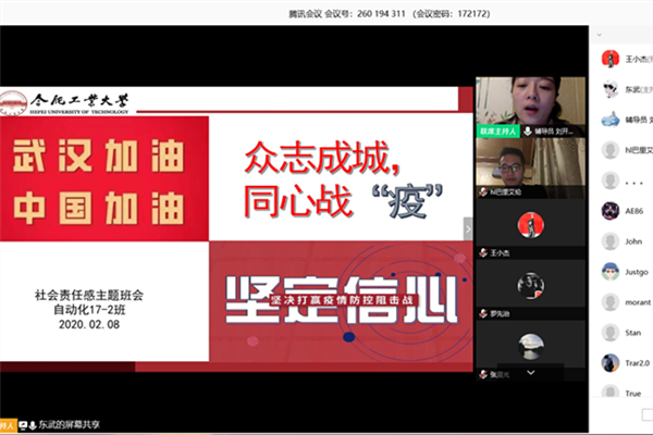 智能电网16-1班围绕“共同战疫、线上就业”主题,重点分析了当前就业形势,积极引导学生通过视频面试、网上签约等招聘形式开展就业工作。电气17-3班围绕“我们与你同心战‘疫’”为主题,阐释疫情发生后人体在情绪上、生理上、思维上、行为上等方面可能会产生的变化和各种不良反应,引导学生积极进行自我调适,并提供学校专业心理援助的渠道。自动化17-2班围绕“众志成城,同心战‘疫’”主题,带领学生学习了奋战在一线的医护人员的典型事迹,号召大家以高度的社会责任感为抗击疫情做贡献。电气18-1班、智能电网18-1班分别以“疫情当下,共同战‘疫’”和“停课不停学”-科学管理假期作息时间为主题,带领学生学习《合肥工业大学新型冠状病毒感染肺炎防护手册(学生版)》,切实提高广大学生防范意识和防治知识,并开展防控行动我先行线上承诺活动。电气19-3班以“共同的战‘疫’”为主题,引导同学们科学做好自我防护,尽可能避免外出,必要出门时要佩戴口罩,勤洗手、勤消毒、勤打扫、勤通风,为控制疫情做出实实在在的贡献。