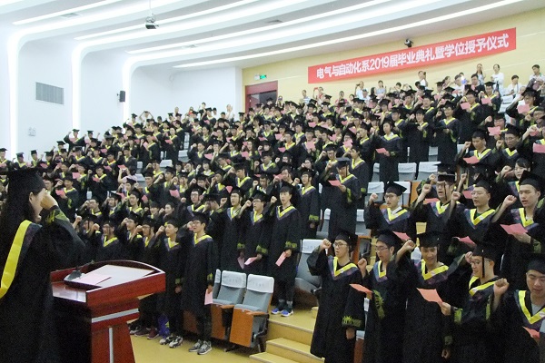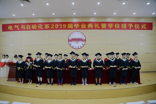 典礼在庄严的国歌声中拉开序幕,学院副院长李红梅教授宣读《电气与自动化工程学院2019届本科毕业生学士学位授予决定》,共计286名同学获得工学学士学位。随后,与会领导、老师们为全体获得学士学位的同学们颁发证书、扶正流苏并合影留念。