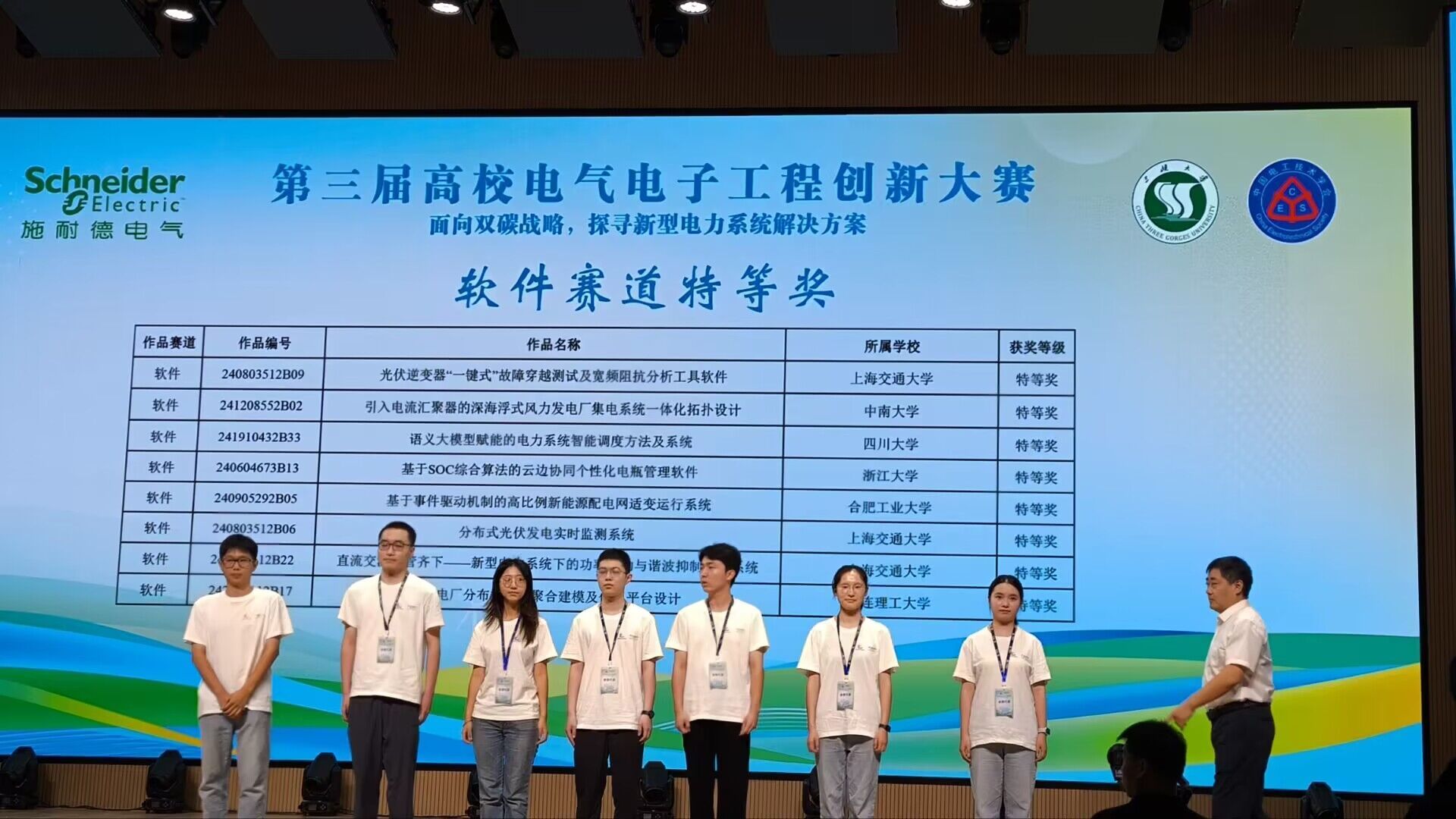 本届大赛于2023年10月启动报名工作,历时10个月,主题为“面向双碳战略,探寻新型电力系统解决方案”,共有来自全国34个省、市、自治区375所高校的3075支队伍参赛,经过赛区初赛、复赛,78所高校的152支队伍成功进入决赛。决赛阶段,历经作品演示、PPT展示、现场答辩等环节,大赛全国总决赛的各个奖项花落有主。本次全国总决赛共评选出全国特等奖23项,其中硬件赛道10项,软件赛道8项,施耐德电气Go Green电力电子创赢赛道5项;最佳创意奖3项,硬件、软件、施耐德电气Go Green电力电子创赢赛道赛道各1项。
