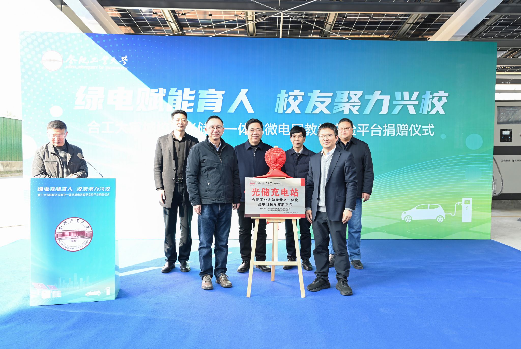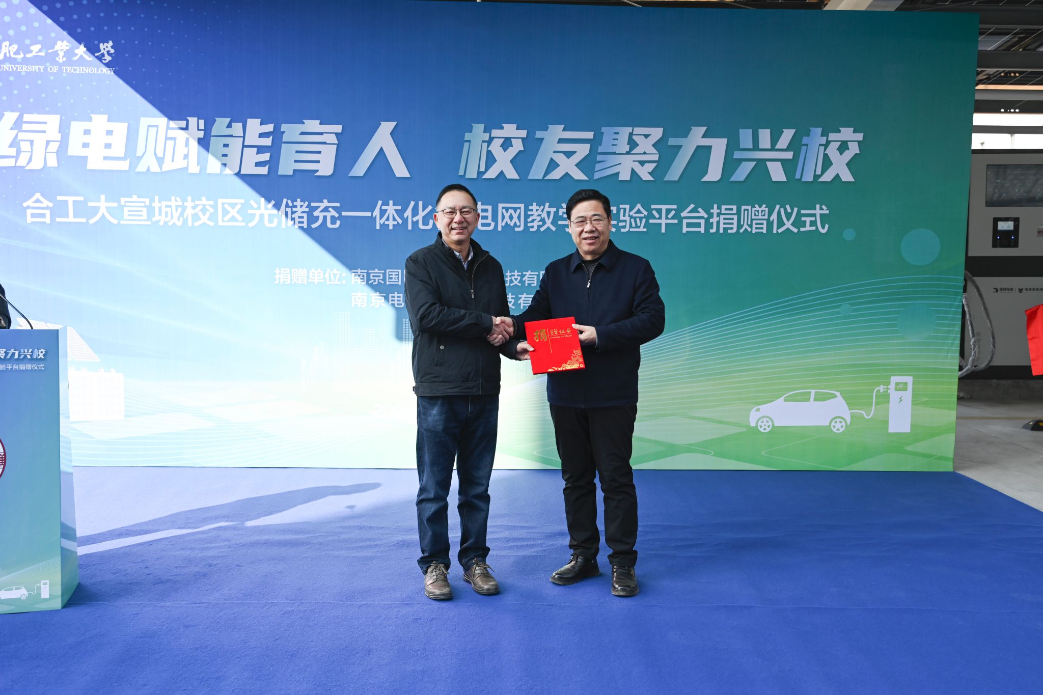 1月16日上午,合肥工业大学宣城校区光储充一体化微电网教学实验平台捐赠仪式在校区光储充电站顺利举行。该平台由合工大校友杨钧旗下的南京国网电瑞电力科技有限公司、南京电瑞新能源科技有限公司联合捐赠,宣城校区管委会主任蒋传东、电气与自动化工程学院院长向念文,以及校企双方代表、校区师生共同参与仪式,仪式由电气与自动化系主任江兵主持。