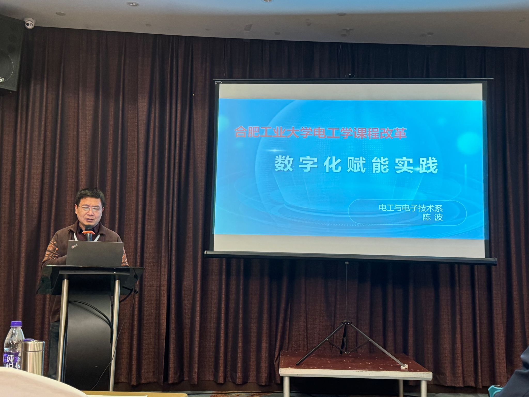 陈波老师代表合肥工业大学电工学课程组做了主题报告,分享了团队多年来在数字化赋能教学改革中的实践与成果。报告主要介绍了通过自动化、云端化和智能化技术手段优化教学流程、提升教学效率、探索创新教学模式的具体实践,展示了通过AI辅助教学、MOOC和雨课堂等技术,构建学情互动反馈和实施精准教学的全过程。