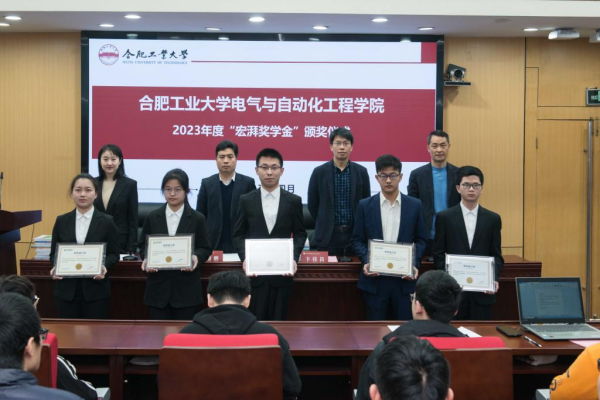 学院学生工作办公室副主任左能宣读了《关于表彰合肥工业大学2023年度“宏湃奖学金”获得者的决定》。“宏湃奖学金”获奖学生代表程乐在发言中代表全体获奖学生向宏湃信息技术有限公司以及辛勤培育学生的母校和老师致以诚挚的敬意和衷心的感谢。他表示作为新时代的电气人,要将“工业报国”情怀深深植根于心,肩负起当代大学生的责任,矢志不渝坚持理想,不负母校培养,为国家、社会和电力行业的发展贡献工大学子的青春力量。
