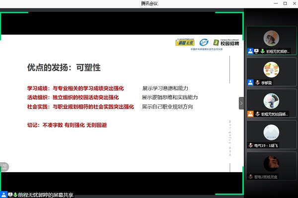 为提升学生的就业竞争力及简历制作能力,5月21日晚,电气与自动化工程学院举行“AI趋势化简历技能”线上讲座。活动邀请了前程无忧校园部经理王恒帅全程在线互动,前程无忧校园招聘部项目执行经理郭婷老师担任主讲,百余名同学参加在线培训。