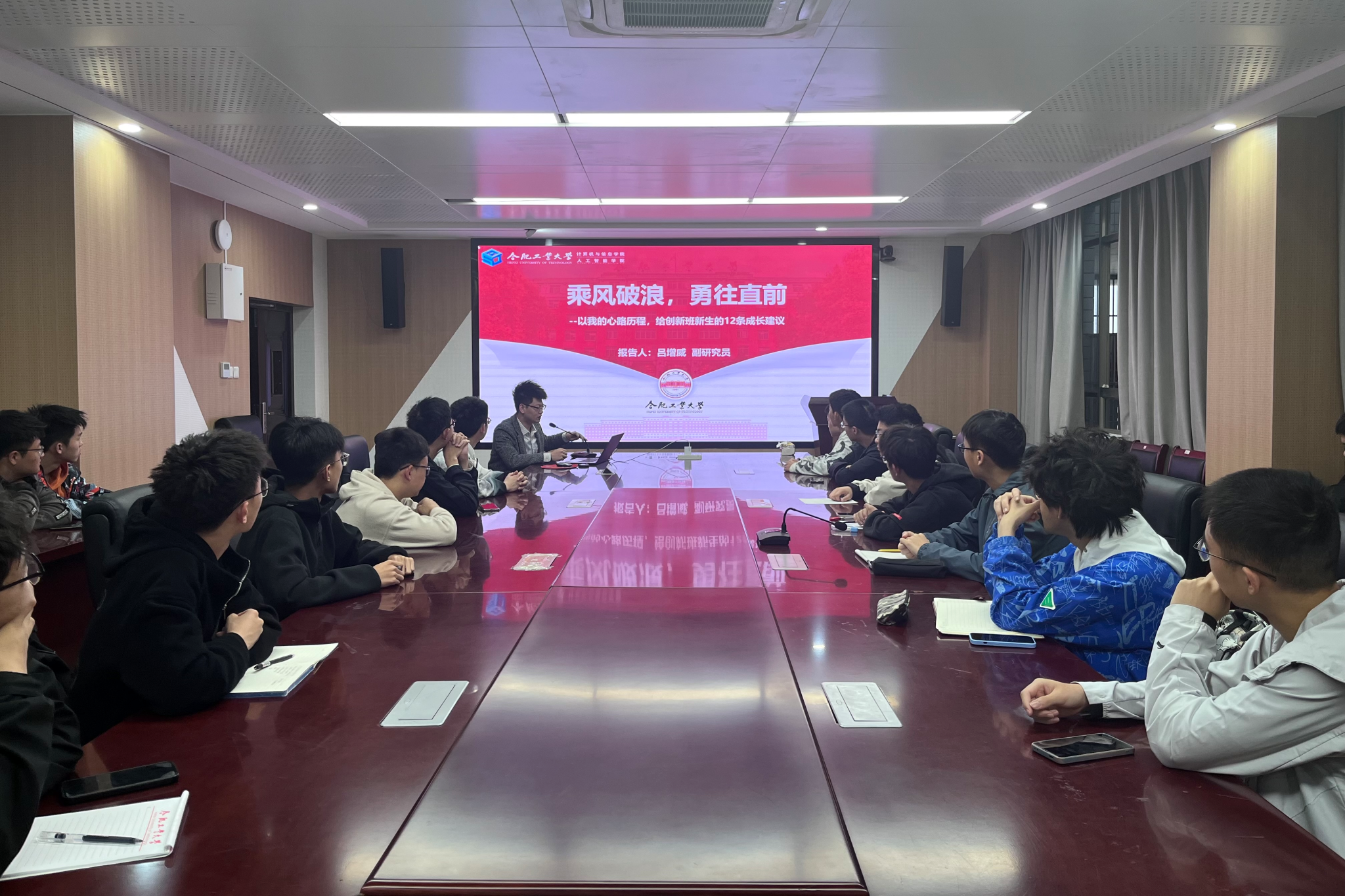 吕增威以《乘风破浪,勇往直前》为题,从个人参赛经历切入,针对与会学生感兴趣的学科竞赛、创新竞赛和创业竞赛展开分析,梳理了以三大赛事为主的A、B类赛事,鼓励学生积极参加第二课堂,培养兴趣驱动能力,树立正确的竞赛观、成绩观。勉励学生在学习成长过程中既要重方略也要重行动,既讲耐心也要讲效率,既有方向感也要有紧迫感,厚积薄发、戒骄戒躁,在实践中体悟科研的魅力。