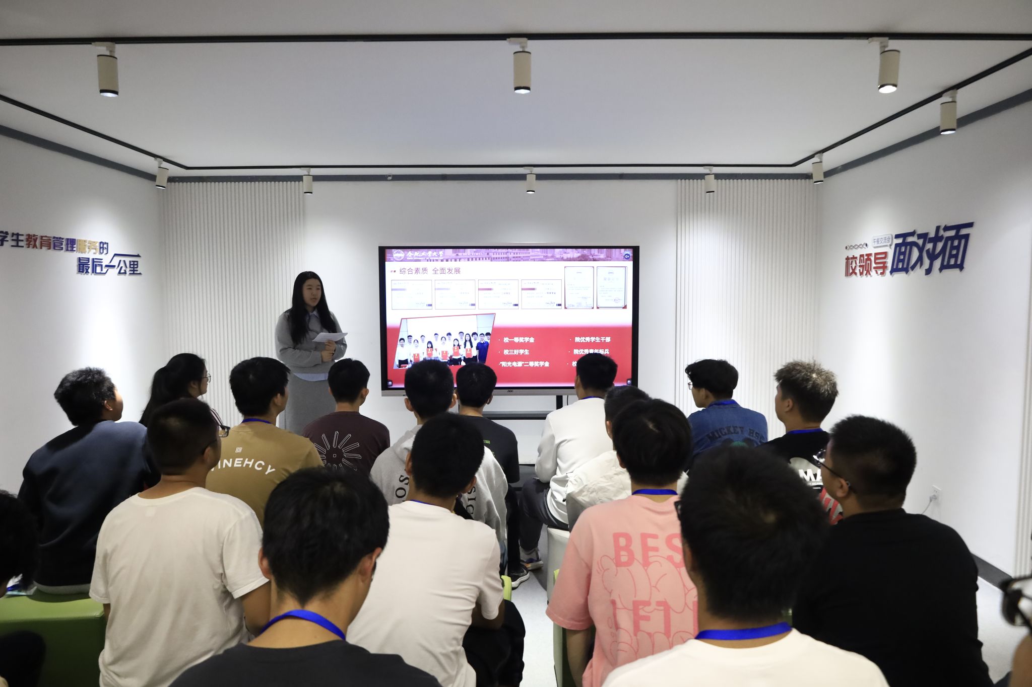 王宇清从“一心向党,矢志不渝”“以学强智,锐意创新”“建设集体,共创佳绩”“躬行践履,实干担当”四个核心维度展开分享,以自身的大学发展经历为主线,结合学校第二课堂成绩单建设,阐释了她在追求五育并举全面发展的征途中不断进取,最终成为一名光荣的党员先锋的成长历程。王宇清鼓励同学们培养学思践悟、争优创新、勇立潮头的先进品质,通过积极参与党团活动,追求红色精神的深度滋养;通过坚持投身科研创新,力争实现工业报国志向,注重思行并进的全面发展。随后,王宇清从宿舍、班级、党团一体化建设三个维度,讲解了对集体与个人共成长的深刻理解,鼓励与会学生充分调动积极性、主动性、创造性,对生活要葆有热爱和赤诚,对信仰要葆有坚毅和清澈,发扬的实干与奋斗精神,将梦想根植于脚踏实地之中。现场交流热烈,反响积极,学生们纷纷表示收获颇丰。