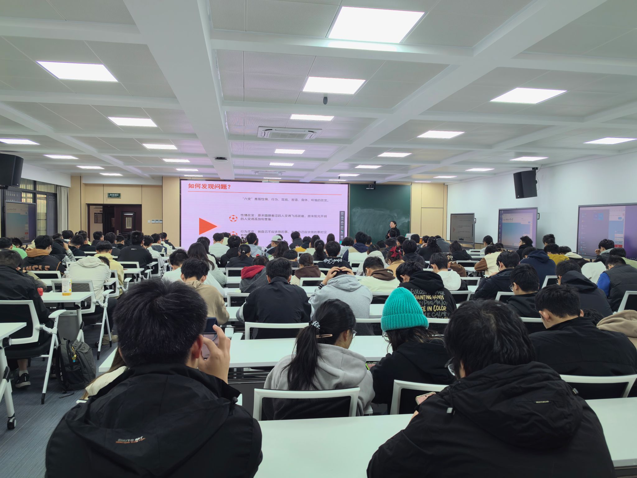 培训伊始,主讲人从一个案例、一组数据、一些思考、一份支持“四个一”引出为什么要设置朋辈心理骨干,用贴近学生实际的案例、具体真实的数据生动地诠释朋辈心理骨干设立的作用与意义。立足四种“角色定位”——知识普及员、情绪侦察兵、心灵支持者、活动引导者,形象展现出朋辈心理支持是什么,即为同龄人之间提供的心理辅导形式,帮助需要心理帮助的同学或朋友,促进人际关系,改善心理健康。以爱心、耐心、责任心“三心”向心理骨干们诠释如何担当好职责:用爱心对待每一位同学,以真诚的态度关心同学们的心理健康;用耐心面对同学的心理问题,遇见问题保持冷静、不急不躁;用强烈的责任心对同学的心理健康负责,发现问题,及时反馈。强调注意和留意“二意”警示灯,注意对同学的言行举止、态度表情,传递积极正向的信息,以细腻的观察留意同学的心理状态和行为表现,依托“六变三托”发现同学们的心理问题;运用求助、陪伴、倾听、锁定位置、给予希望等方法应对解决同学们的心理问题。在培训会结尾,监测工具班级心理晴雨表,晴雨表能详细记录每周班级的心理状况、特殊情况,让各班心理委员能关注班级成员的心理状态与变化,更好地开展工作,为同学们的心理健康作出坚实保障。