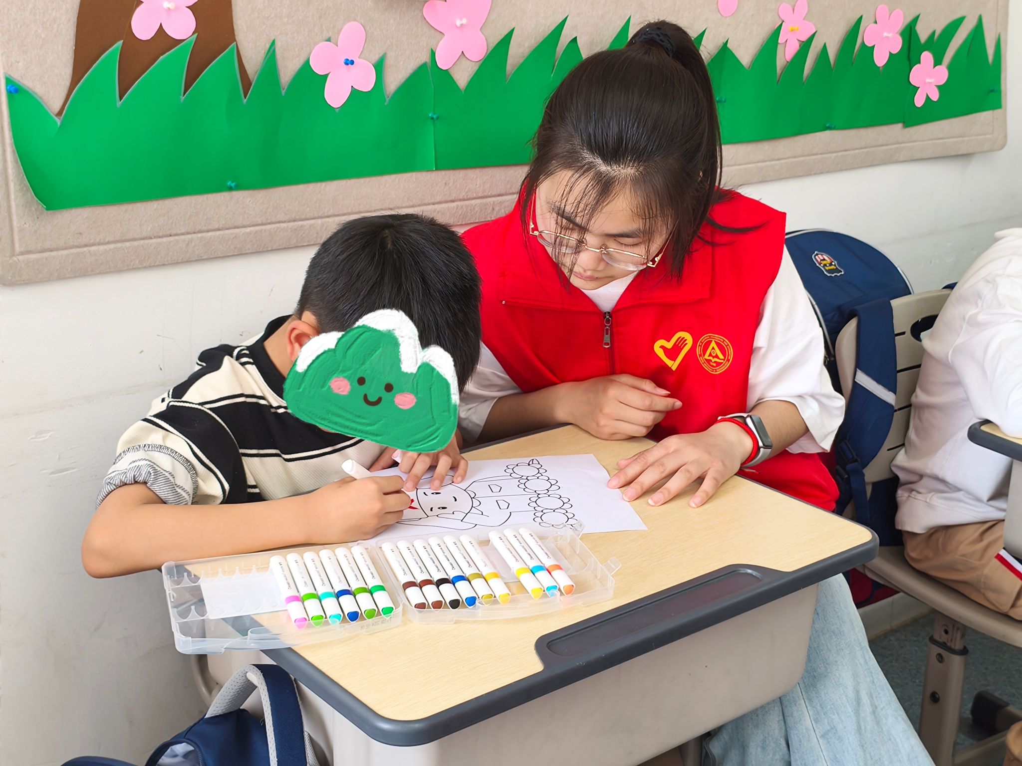 “熠”彩涂绘,童心画锋。在手工涂色环节,志愿者为孩子们分发简笔画模板和水彩笔,手把手教他们描绘雷锋形象。“先画五角星,再涂帽檐……”孩子们小心翼翼地涂抹,描绘心中的雷锋形象。当一幅幅“学习雷锋”简笔画完成,孩子们迫不及待举在头顶展示,露出开心的笑容。一幅幅“雷锋叔叔”的图画不仅是艺术创作,更是爱心与敬意的传递。