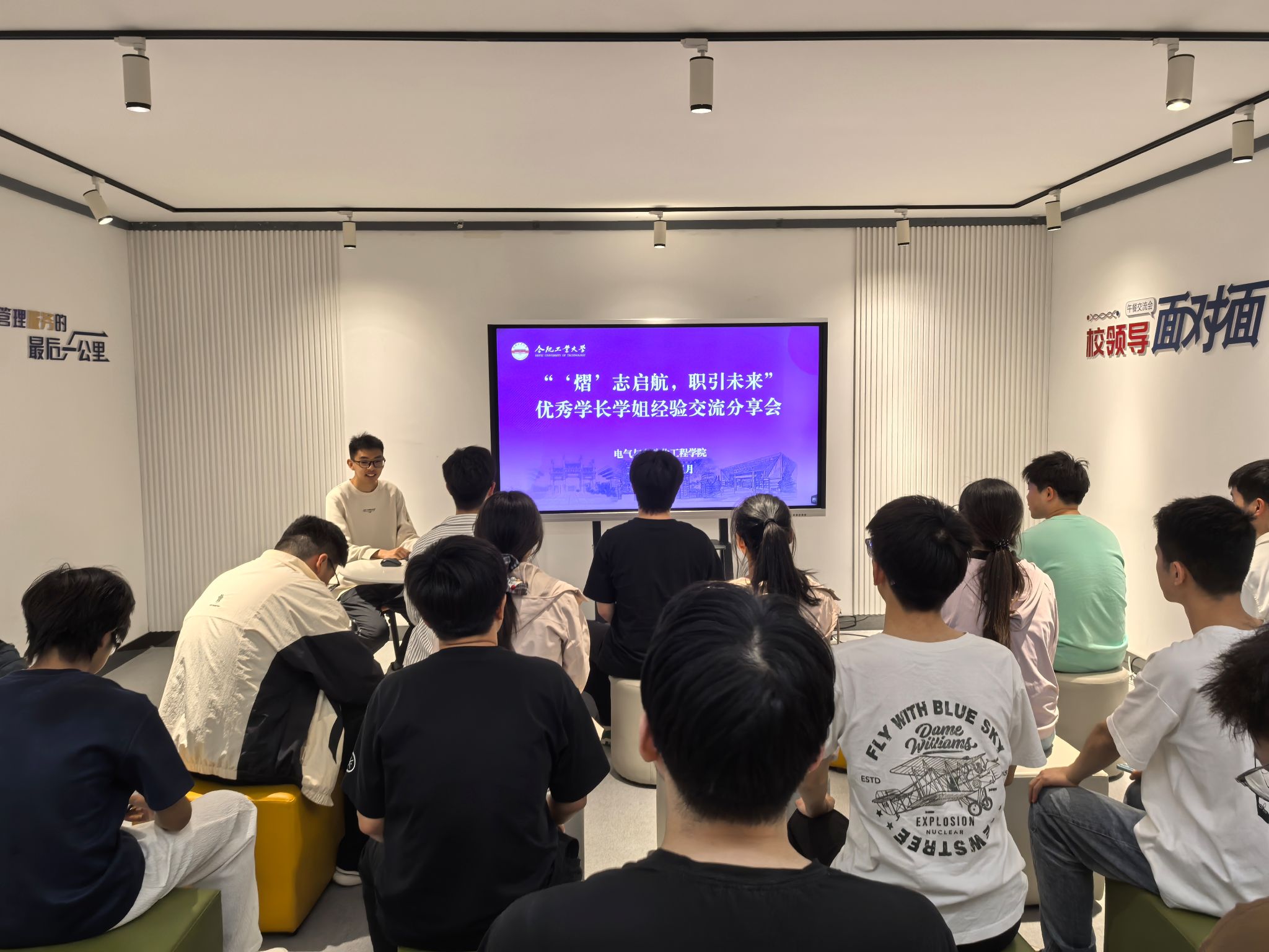 为发挥优秀学生的榜样引领作用,帮助学生明确发展方向路径。5月13日晚,电气与自动化工程学院在屯溪路校区七号楼学生社区沙龙空间开展“‘熠’志启航,职引未来”优秀学长学姐经验交流分享会。邀请宗兴泽、陶根、刘千皓、李泽一四位优秀学长,分别围绕就业、保研、考研开展交流分享。