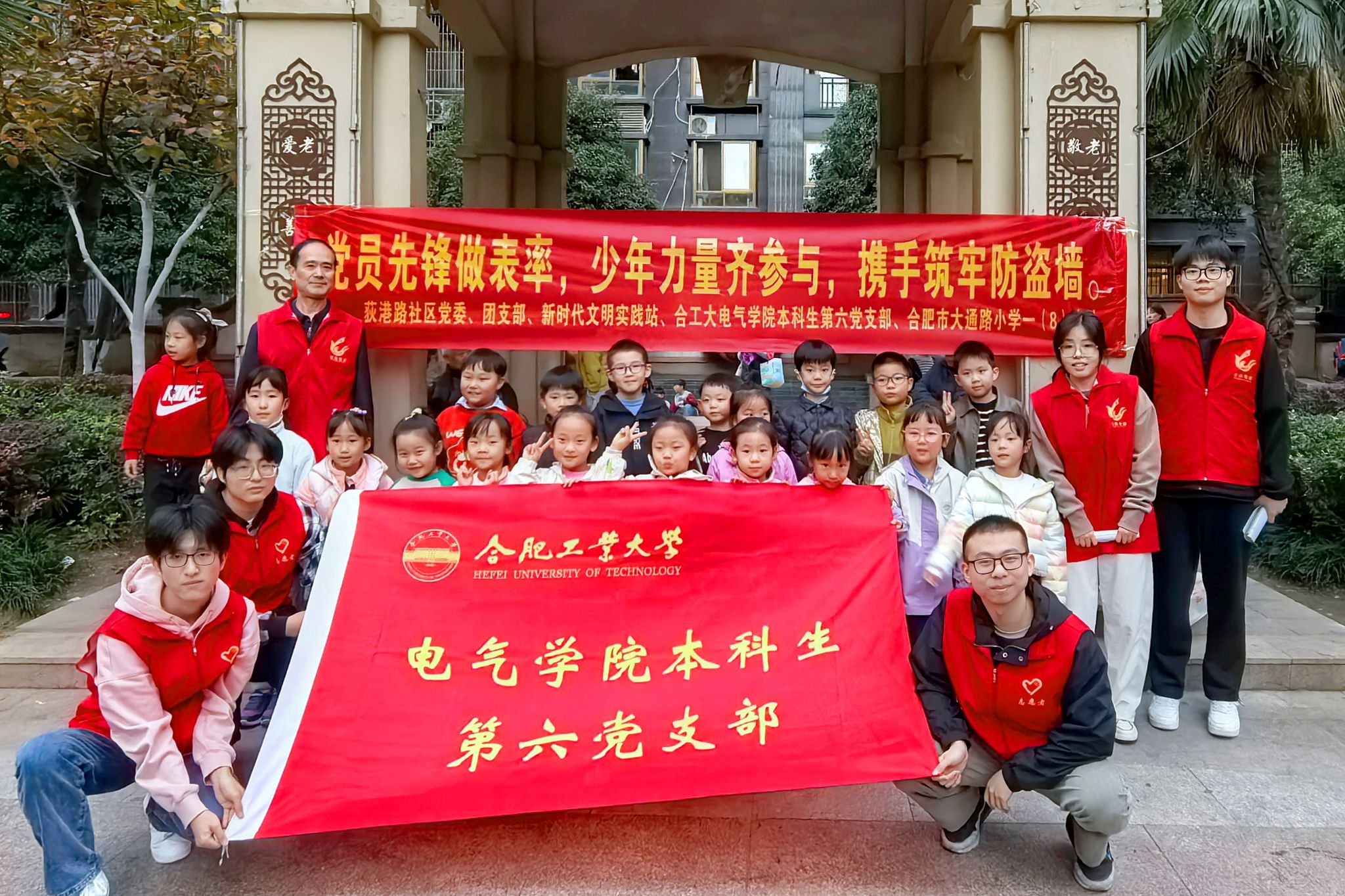 11月12日,电气与自动化工程学院赴瑶海区和平路街道荻港路社区开展“党员先锋做表率,少年力量齐参与,携手筑牢防盗墙”主题活动。学院本科生第六党支部师生代表、社区相关负责同志、大通路小学学子、社区“红色小管家”等参加。