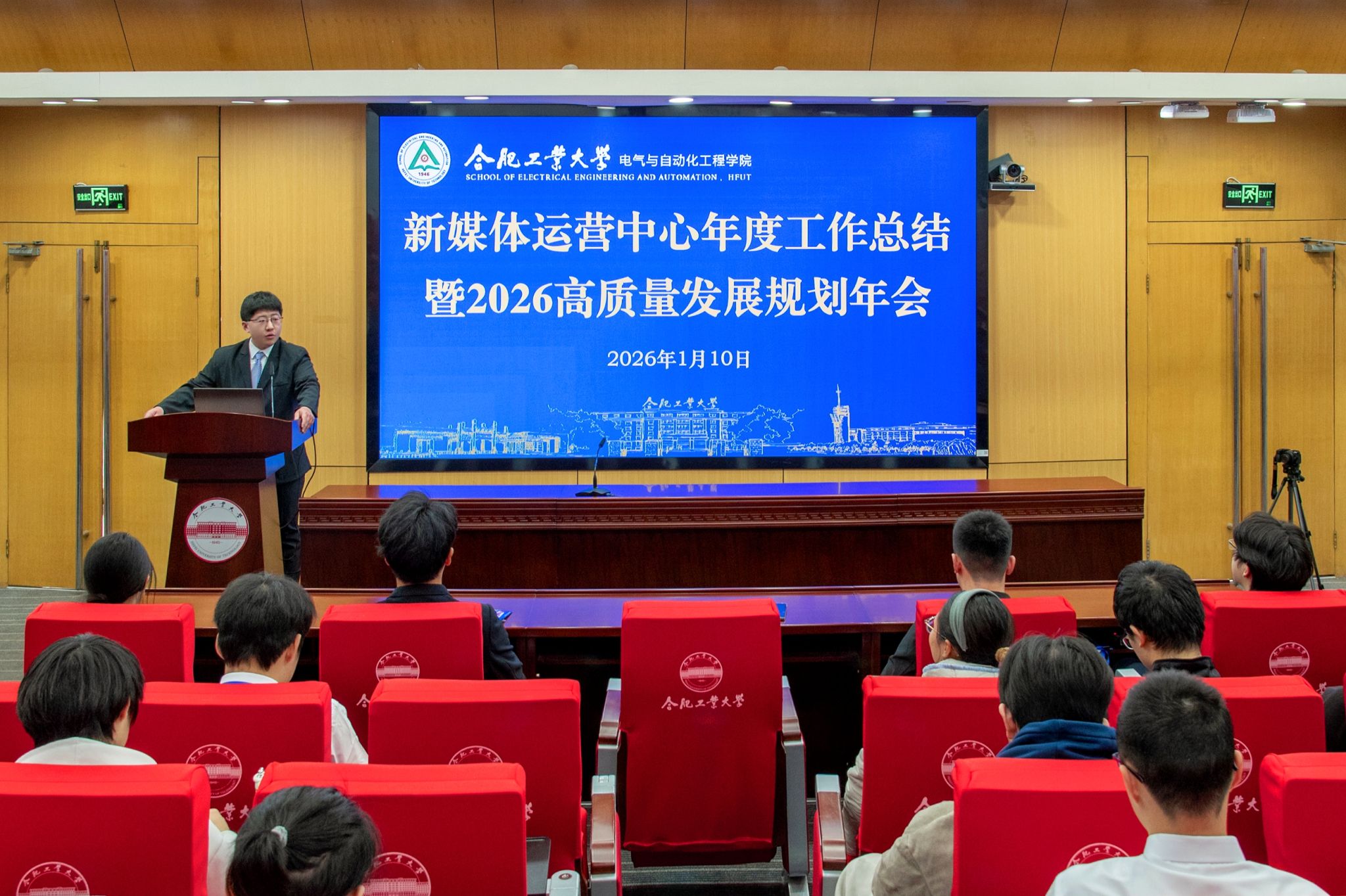 1月10日,电气与自动化工程学院于学术会议中心二楼报告厅举行新媒体年度总结暨2026发展规划年会。学院相关负责教师、新媒体运营中心全体成员、往届骨干代表参加。