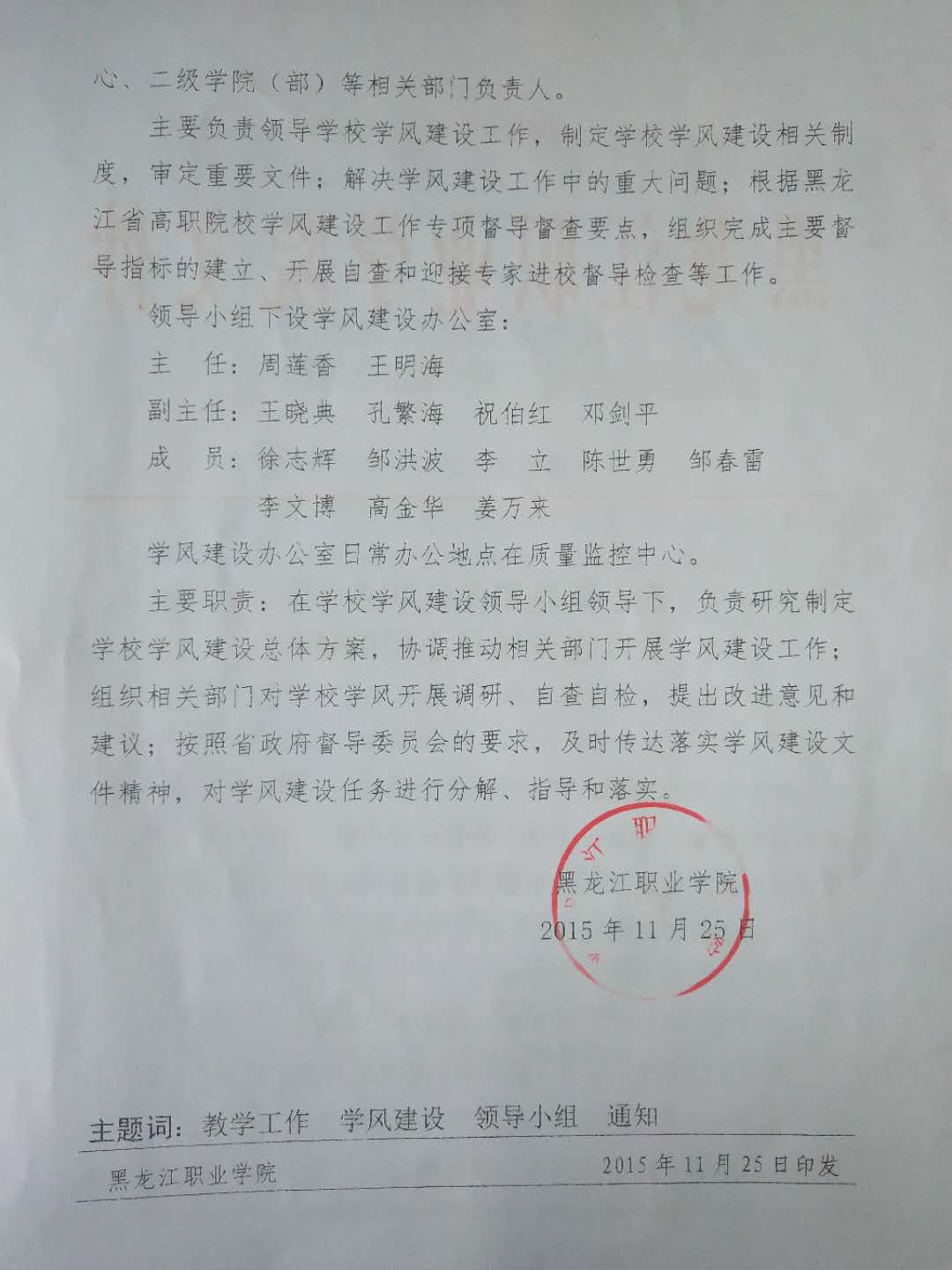 关于调整黑龙江职业学院学风建设领导小组的通知
