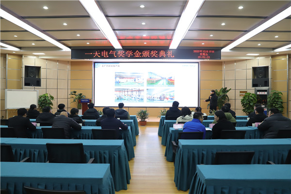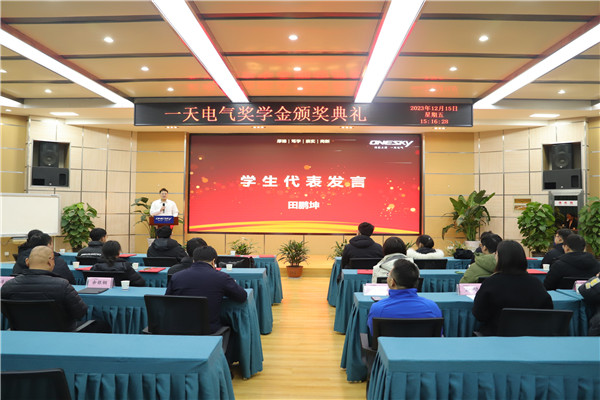2022级硕士研究生田鹏坤代表获奖学生发言,他对捐资单位、学校、学院领导和老师们致以诚挚的谢意,表示将不断学习以一天电气为缩影的中国高新技术企业发展中的创新精神,从而用知识武装自己,深耕专业领域,锐意进取,实现自我价值的同时,也为我国电气工业发展贡献一份力量。也希望这个奖项能够激励更多的工大电气学子,去追求知识,追求梦想,为社会做出更多更大的贡献。