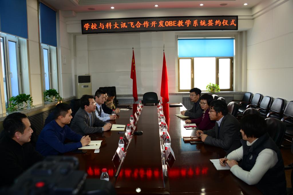 12月22日,我校与科大讯飞股份有限公司、南京一酷数码科技有限公司合作开发OBE教学系统签约仪式在主楼900会议室举行。科大讯飞教育事业群副总裁王卓、总裁助理刘国飞,南京一酷数码总经理薛华东,微助教负责人肖宇,学校校长于沐琳,校长助理、教师发展中心主任王晓典,校办公室主任王广文等出席签约仪式。