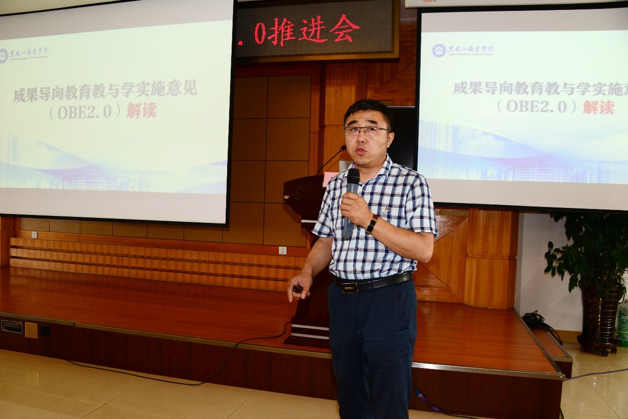 会上,王湘玮、杨井坤、黄雨鑫、李晓松和于德洋等五位教师从课程开发设计、课堂教学实施、特色经验不足、改革实施、改革成效等方面分别介绍了通识类课程、专业基础课程、专业核心课程、专业拓展课程和活动课程五种类型课程的改革情况和取得的经验。王晓典对OBE2.0的工作任务和实施内涵进行了解读。