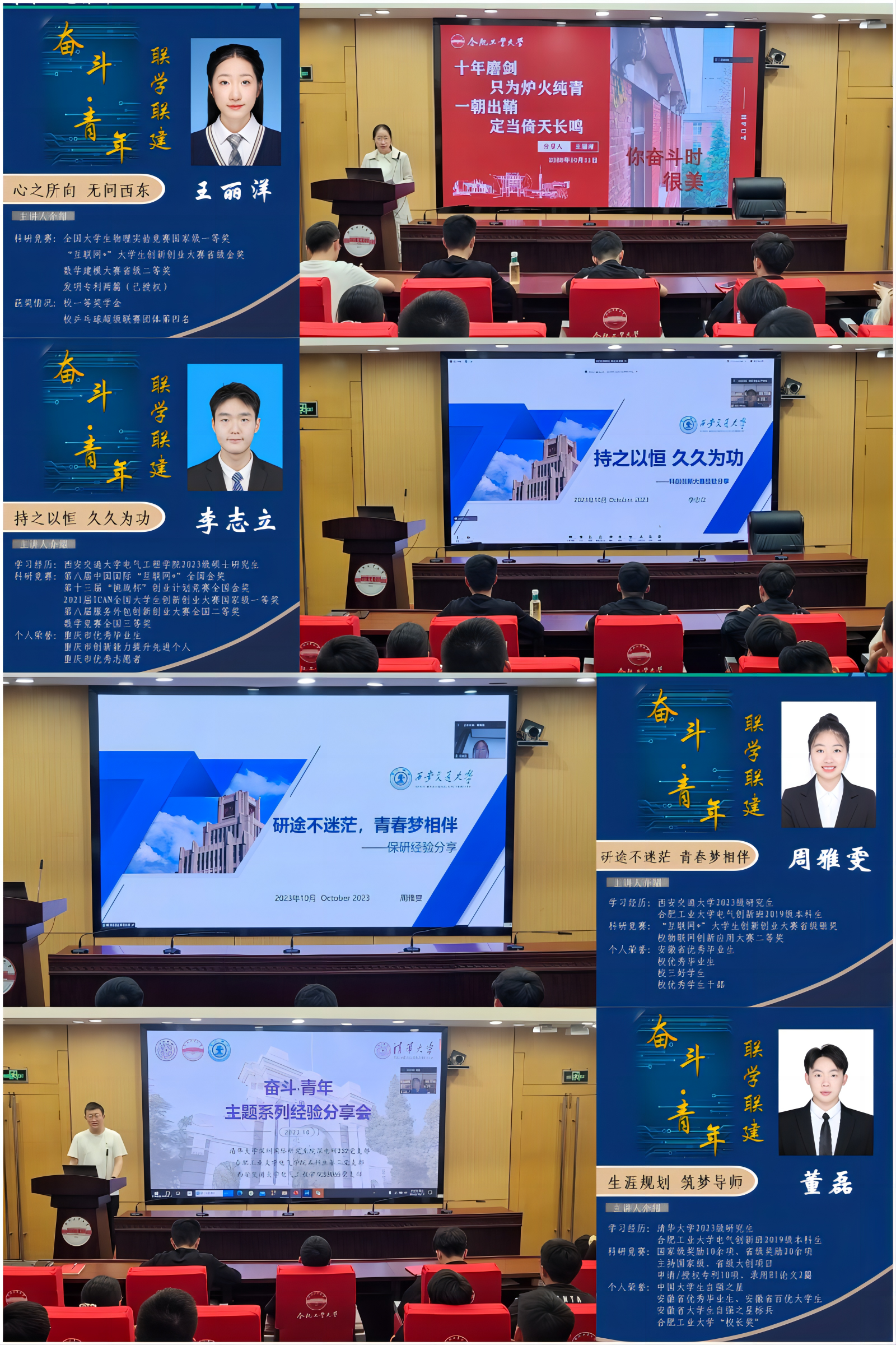 来自西安交通大学电气工程学院S3065党支部的李志立和周雅雯,分别围绕科创能力提升和学业职业规划展开分享。李志立以“持之以恒,久久为公”为主题,结合“大创”“互联网+”“SCI”延伸科研体悟,鼓励大家在科创比赛、项目申报、论文撰写等领域都要大胆试错,并从科研项目产生、项目实践到成果产出,拨云见日、指点迷津,为在校大学生提升科研能力和素养指明方向。周雅雯身为工大学子,表达了对母校的深深眷恋之情,并对学弟妹们寄予美好希望。她以“‘研’途不迷茫,青春梦相伴”为主题展开分享,在互动提问中启发同学们思考“个人发展和社会发展的关系”,在旁证博引中帮助同学们厘清“目标定位和发展路径的选择”,并针对同学们的发展问题和成长困惑,从时间管理、提升自信和提高执行力等方面给出个性化、合理化建议。