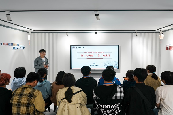“展艺·青年”,恣意青春。在学生社区七号楼沙龙空间,校十佳文体素质标兵、青春筑梦导师苏钰雅从专业学习、科技竞赛、艺术体育、课余生活等多维度分享成功“秘籍”,独特意志、多元发展,四年的晨起迎朝阳,挑灯战黄昏,一次次伏案实验测数据,无数次跌倒再爬起,她在困境中磨炼意志,在挫折中积累经验,在挑战中成就自我,她以“非典型多面体”形容自己,并以“勤奋、自律、担当”激励电气学子奋发有为、坚毅前行。校音乐部部长张炜以“用实践传递使命,以奉献点燃青春”为题,从自身学生干部、文艺竞赛、公益志愿等实践经历出发,鼓励同学们要勇于试错,以失败为崭新开始,勤于反思,在修正中提升自我。