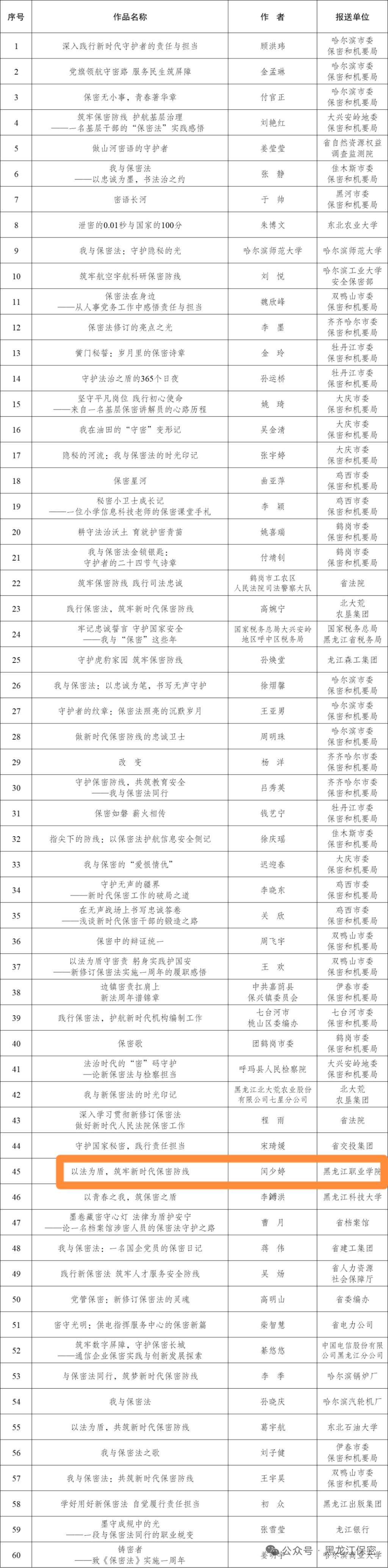 近日,中共黑龙江省委保密委员会办公室、黑龙江省国家保密局公布了“我与保密法”保密主题征文活动获奖名单。学校凭借扎实的组织工作和高质量的征文作品,荣获“优秀组织奖”称号,成为全省十家获此殊荣的单位之一,更是唯一获此奖项的高职院校。这一荣誉不仅是对学校保密宣传教育工作的高度肯定,更是学校长期以来重视保密工作、积极推动保密文化建设的有力见证。
