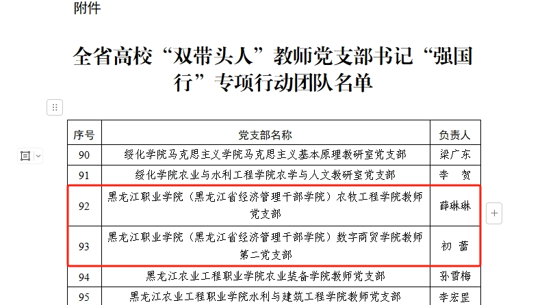 近日,黑龙江省委教育工委公布了全省高校“双带头人”教师党支部书记“强国行”专项行动团队名单,我校农牧工程学院教师党支部、数字商贸学院教师第二党支部成功入选全省高校“双带头人”教师党支部书记“强国行”专项行动团队。