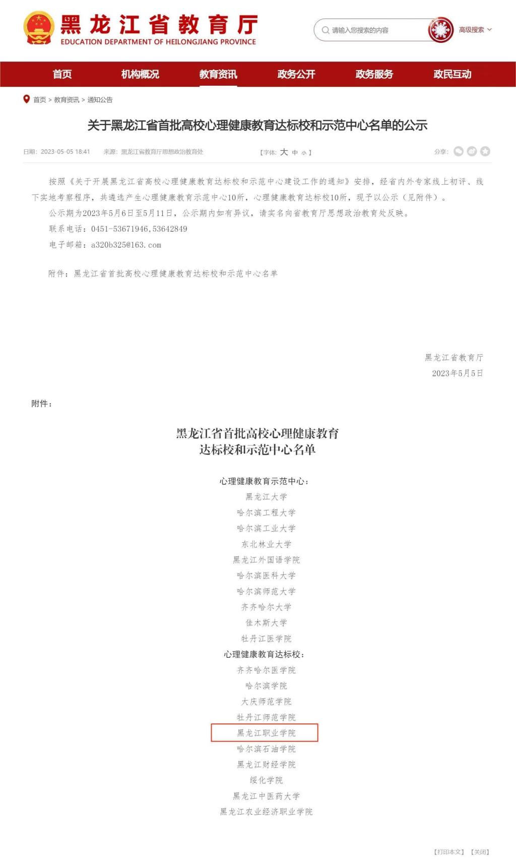 日前,黑龙江省首批高校心理健康教育达标校和示范中心名单公布,经省内外专家线上初评、线下实地考察程序,我校获批“黑龙江省高校心理健康教育达标校”,位列全省高职院校第一名。