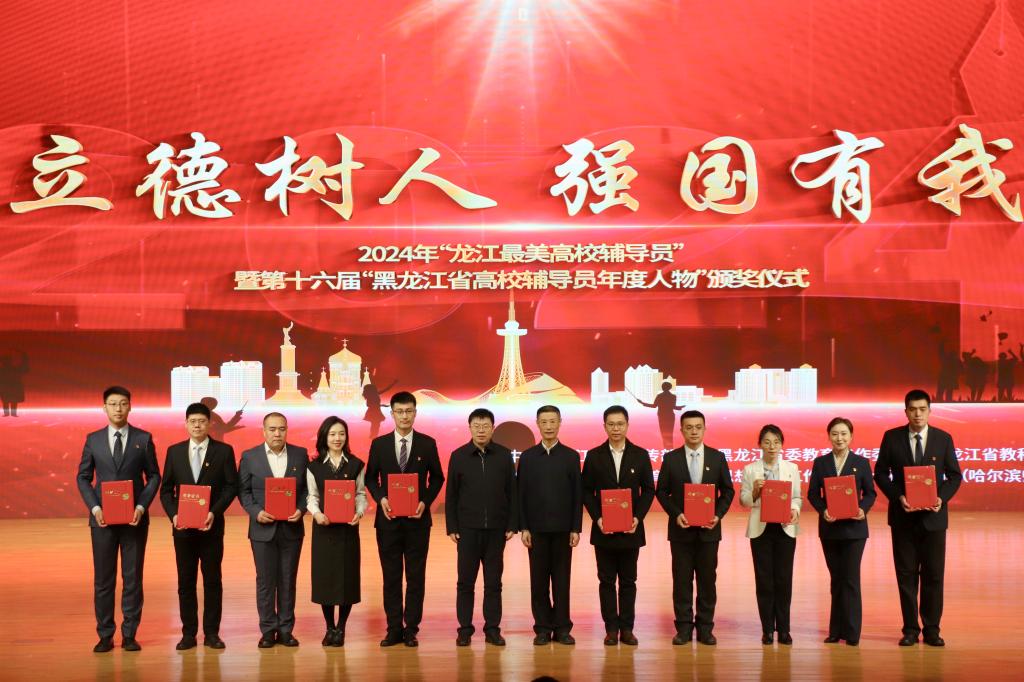 ▲第十六届“黑龙江省高校辅导员年度人物”获得者于德洋(右一)上台领奖