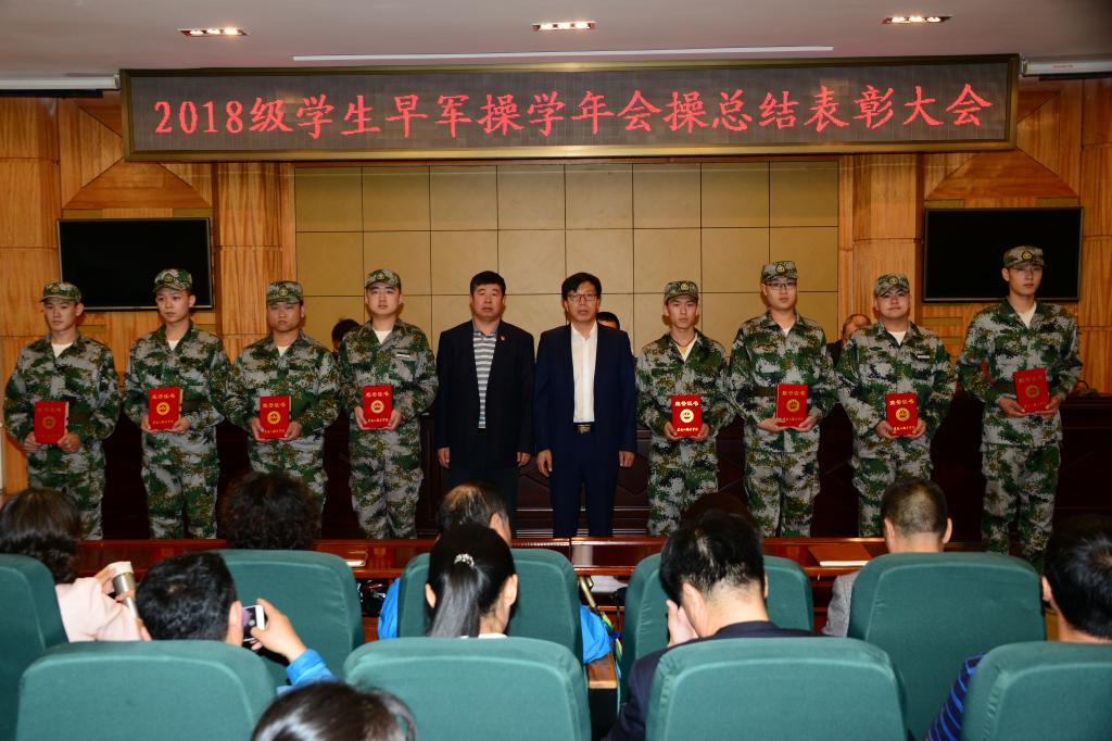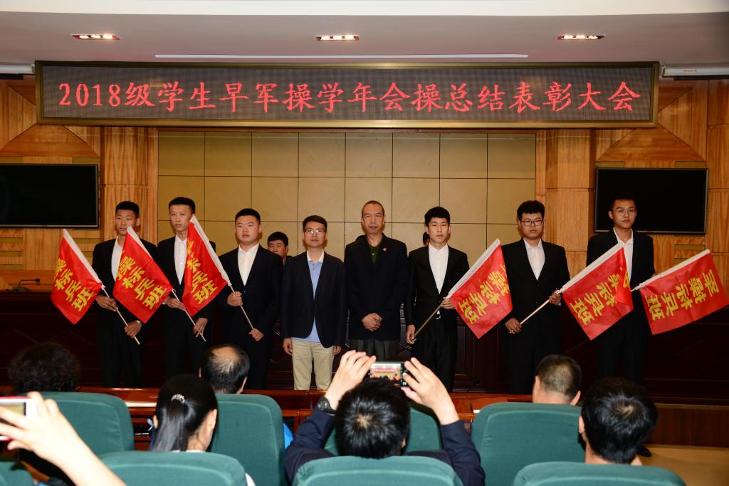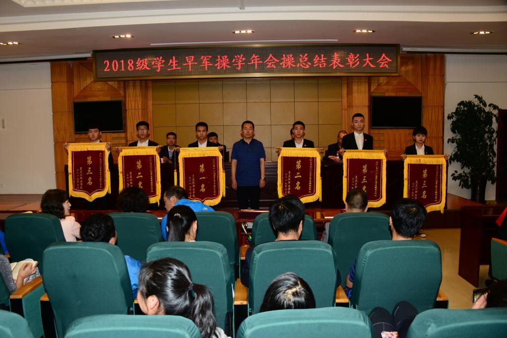 会上,学生处副处长陈宇辉宣读2018-2019学年学生早军操评比表彰决定,此次表彰共有40各班级获得“军操标兵班”荣誉称号,98名学生干部获得“军操管理标兵”荣誉称号,工商管理学院获得早军操2018-2019学年综合评比第一名。学校领导为获奖单位和个人颁发了证书、奖品和奖旗。