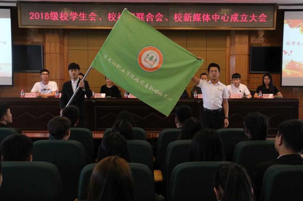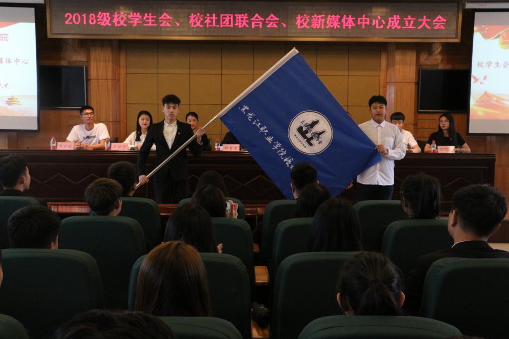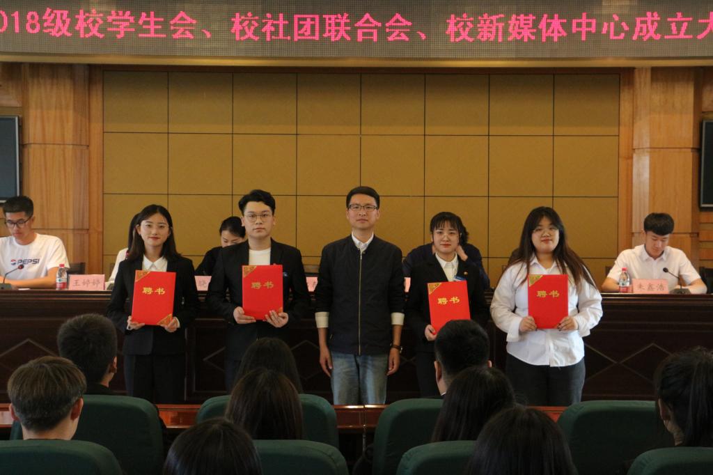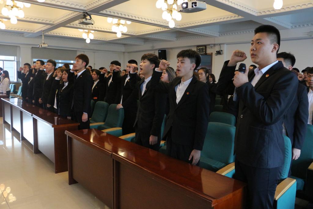 会上,杜超宣读《关于拟推荐朱鑫浩、陈宇航、郭思雨为2019-2020学年校团委兼职学生副书记的决定》;唐晓恬宣读《关于校团委老师分工分管的决定》;陈佳男宣读《关于拟任命2018级校学生会、校社团联合会、校新媒中心主要学生干部的决定》;王婷婷宣读《关于拟任命2018级校社团联合会各社团社长的决定》;朱鑫浩宣读《关于聘任邹良潇等6名2017级学生干部为2018级校级学生会、校社联、校新媒顾问指导的决定》,邹春雷为邹良潇等六名同学颁发聘书;陈宇航宣读《关于2018级校学生会、校社联、校新媒主席团分工分管的决定》;郭思雨宣读《2018级校学生会、校社联、校新媒主要学生干部“自律15条”》。会上,2017级各学生组织主席和2018级各学生组织主席进行了会旗交接,并进行了学生组织的口号展示,2018级校学生会主席张昊睿同学带领全体学生干部进行入职宣誓。