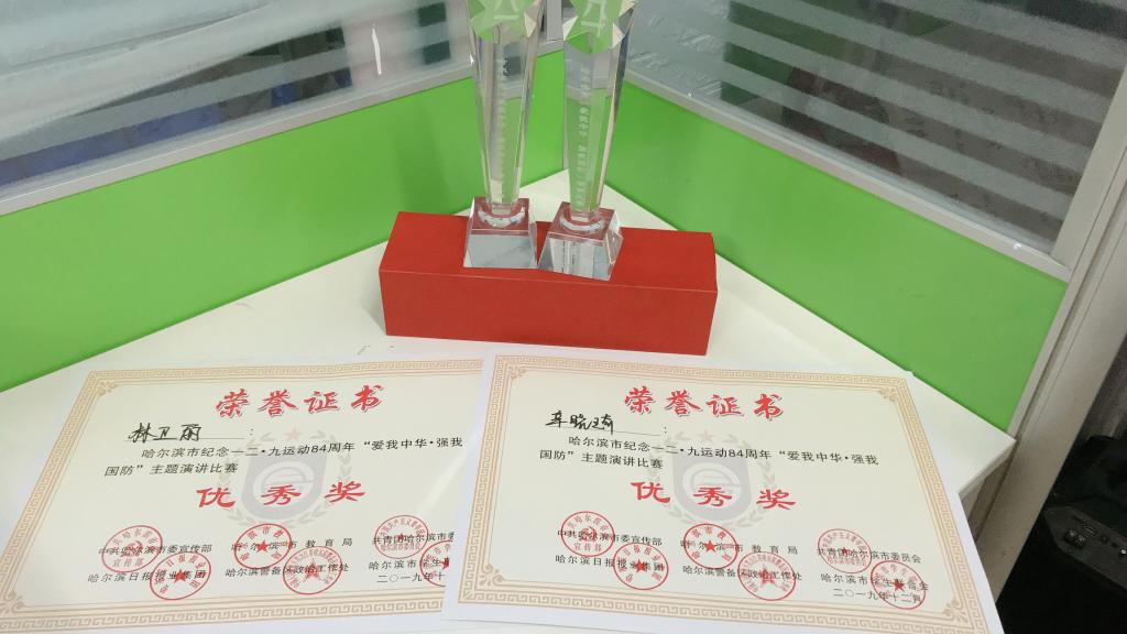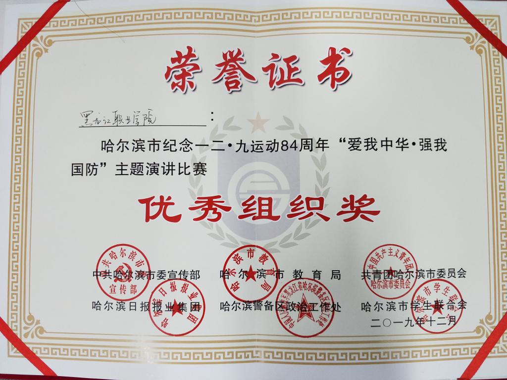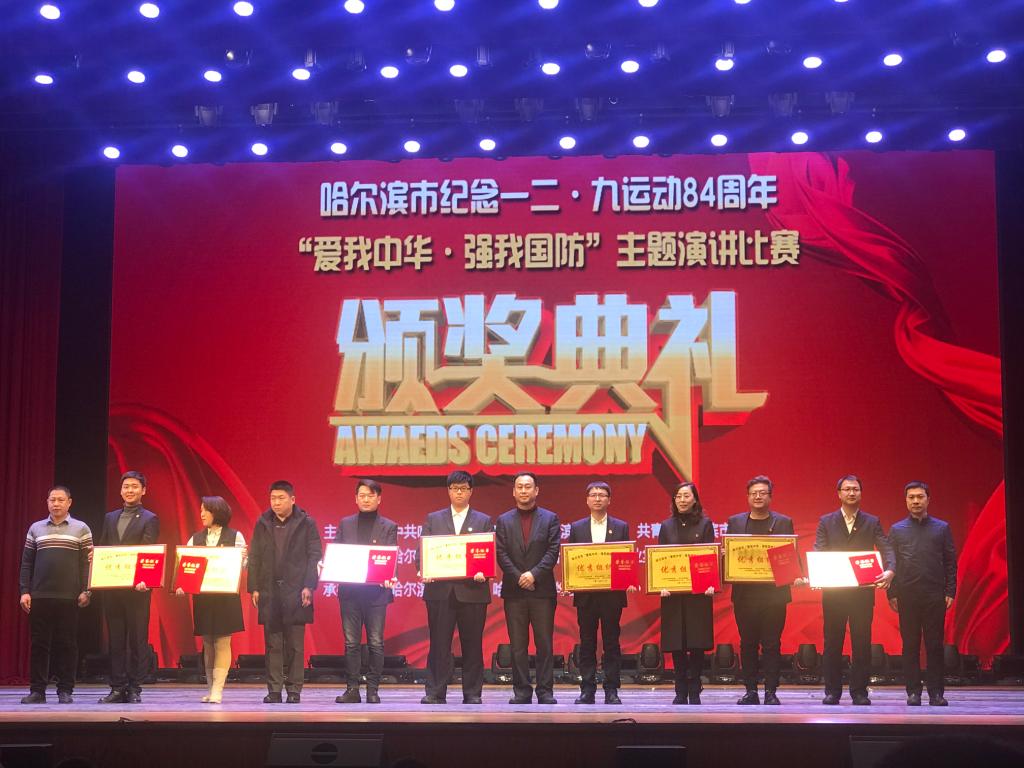 12月9日,哈尔滨市纪念一二·九运动84周年“爱我中华·强我国防”主题演讲比赛在哈尔滨青年宫举办。大赛由中共哈尔滨市委宣传部、哈尔滨市教育局、共青团哈尔滨市委员会、哈尔滨警备区政治工作处、哈尔滨日报报业集团主办,哈尔滨青年宫、哈尔滨市学生联合会承办,来自哈尔滨市属高校的12名选手以及600余名学生参加了活动,我校由团委书记邹春雷率队参加大赛,并获得多个奖项。
