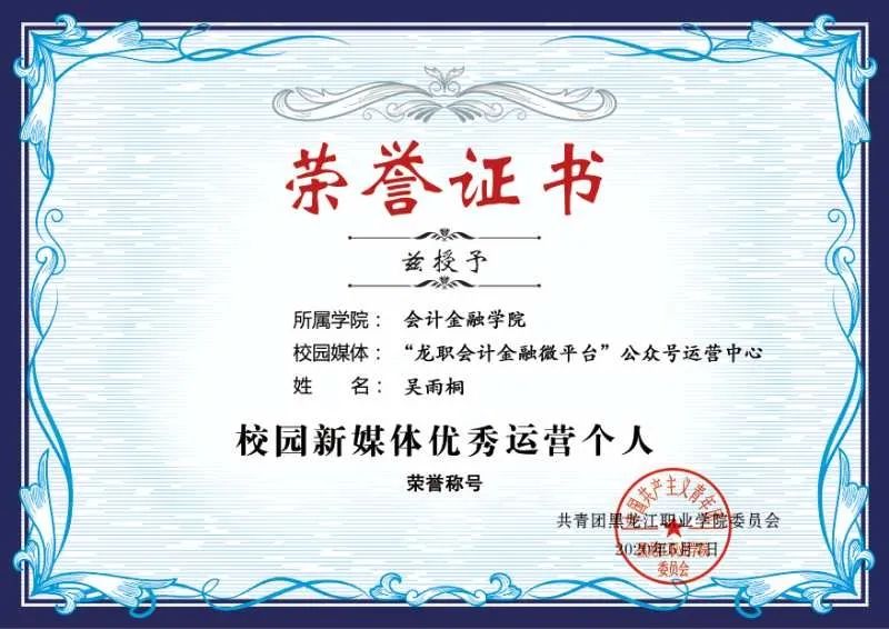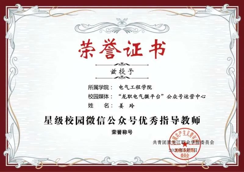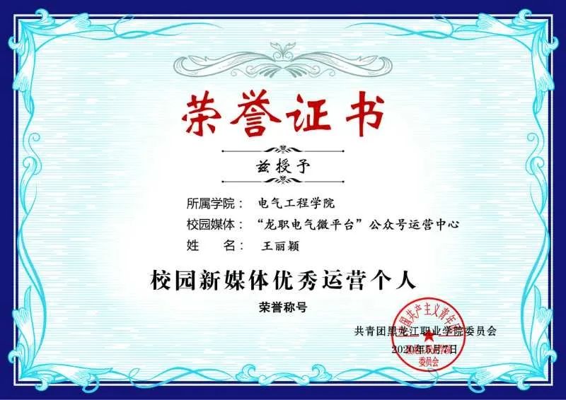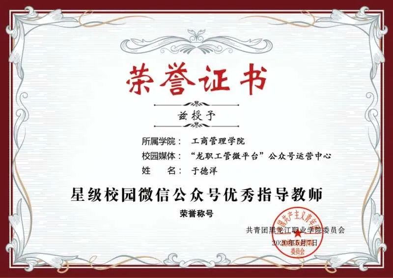 会上,宣传统战部干事、“黑龙江职业学院”官微公众号执行运营总编纪姿含做了点评,并公布了获奖名单。工商管理学院、会计金融学院、电气工程学院分别荣获“星级校园微信公众号”荣誉称号;工商管理学院代理团总支书记于德洋、会计金融学院团总支书记姜婷婷、电气工程学院团总支书记姜玲分别荣获“星级校园微信公众号优秀指导教师”荣誉称号;工商管理学院刘丽利、会计金融学院吴雨桐、电气工程学院王丽颖三名同学分别荣获“校园新媒体优秀运营个人”荣誉称号。校团委书记邹春雷为获奖集体和个人颁发了电子版荣誉证书。