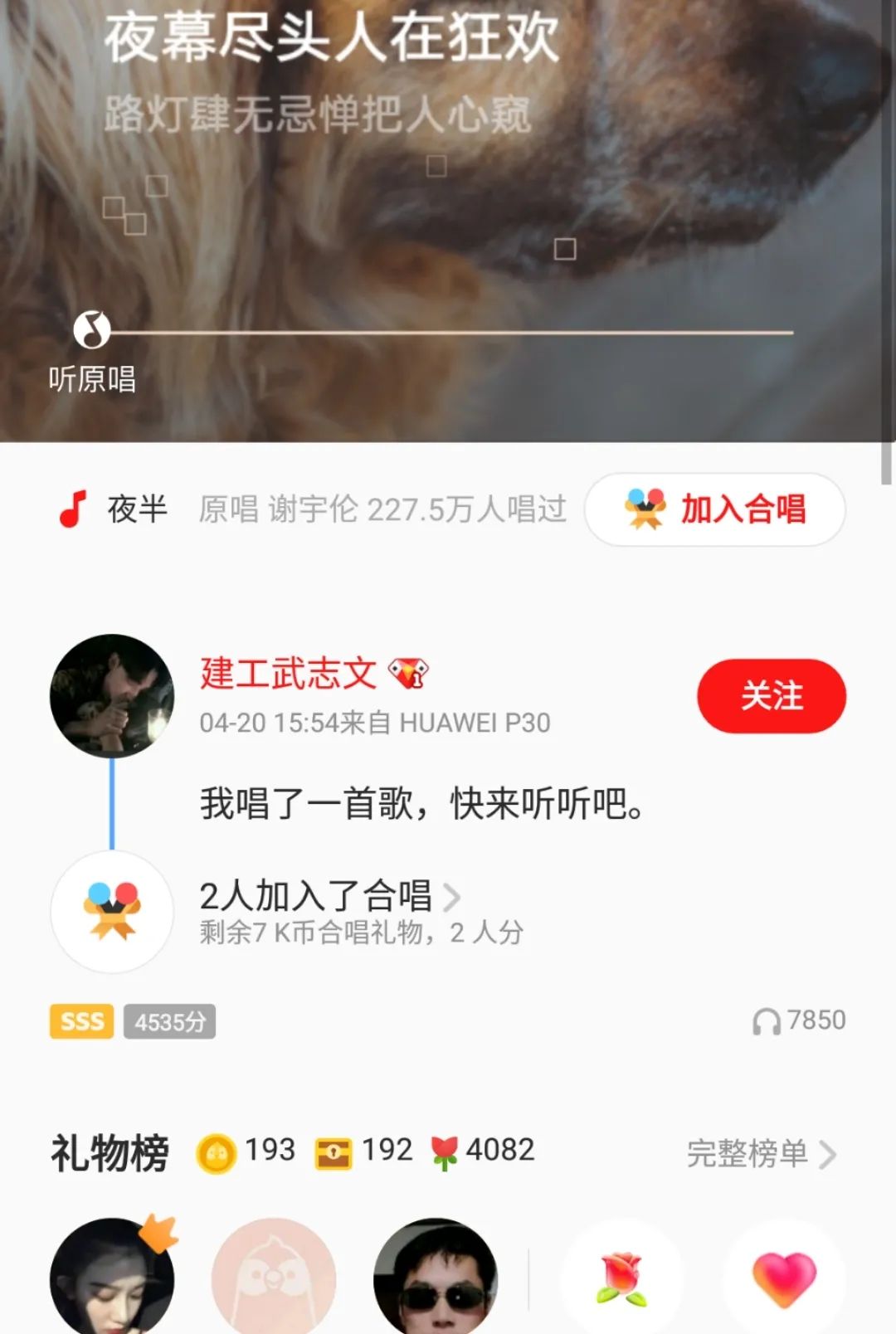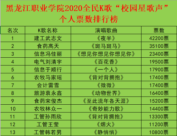 5月4日我校校园海选赛截止当天,我校以76.8万总票数的绝对优势名列该大赛北部区域榜第一名;以3.4万K星值强劲势头名列该大赛全国高校飙升榜第八名;我校建筑工程学院武志文同学的参赛作品《夜半》,以4.2万票的超强人气名列全国个人榜第七名。