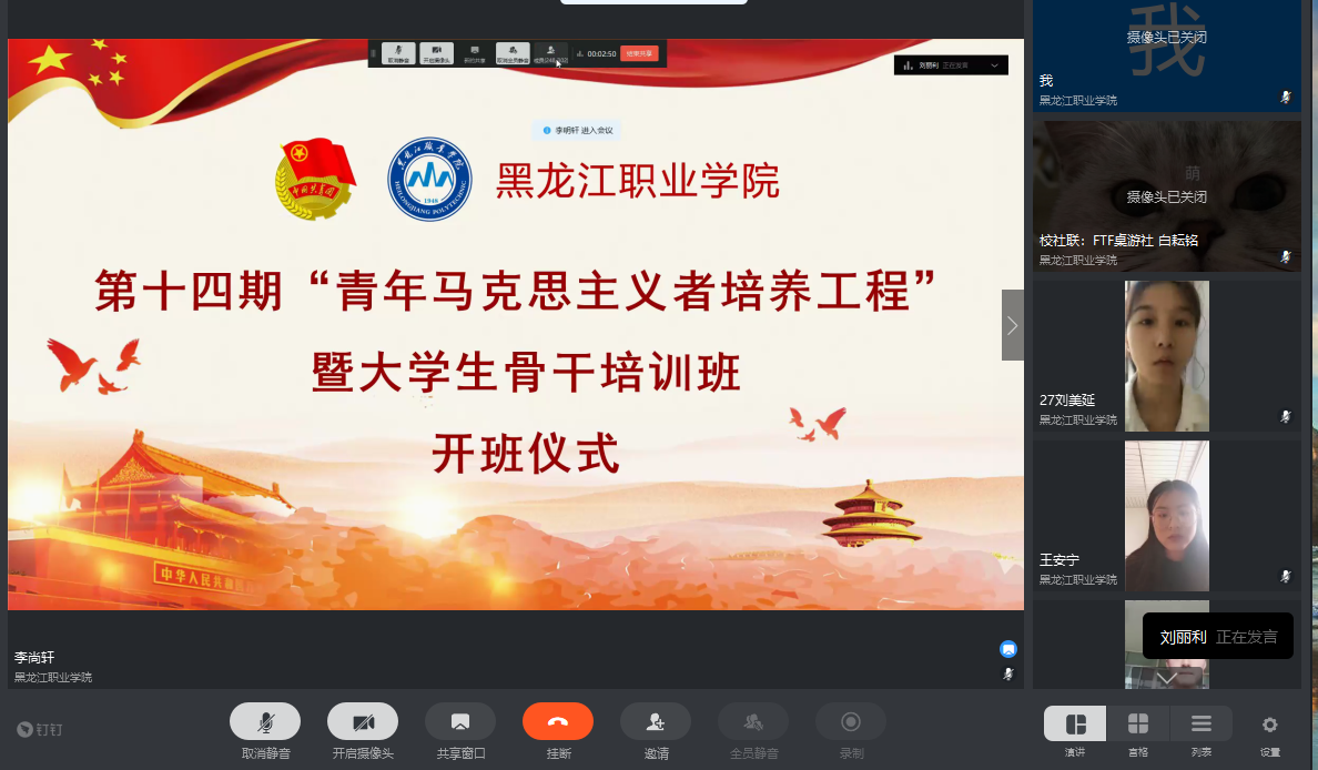 开班式上,全体学员观看《追梦青春——黑龙江职业学院团委2019年图文影音大事记》;培训班学员代表、校学生会主席刘昊凝代表学员作大会发言;团委学生副书记李尚轩宣读了《关于举办第十四期“青年马克思主义者培养工程”暨大学生骨干培训班的通知》;唐晓恬宣读了《培训班分组及组长、副组长名单》;杜超宣读了《培训班学员管理规定》。