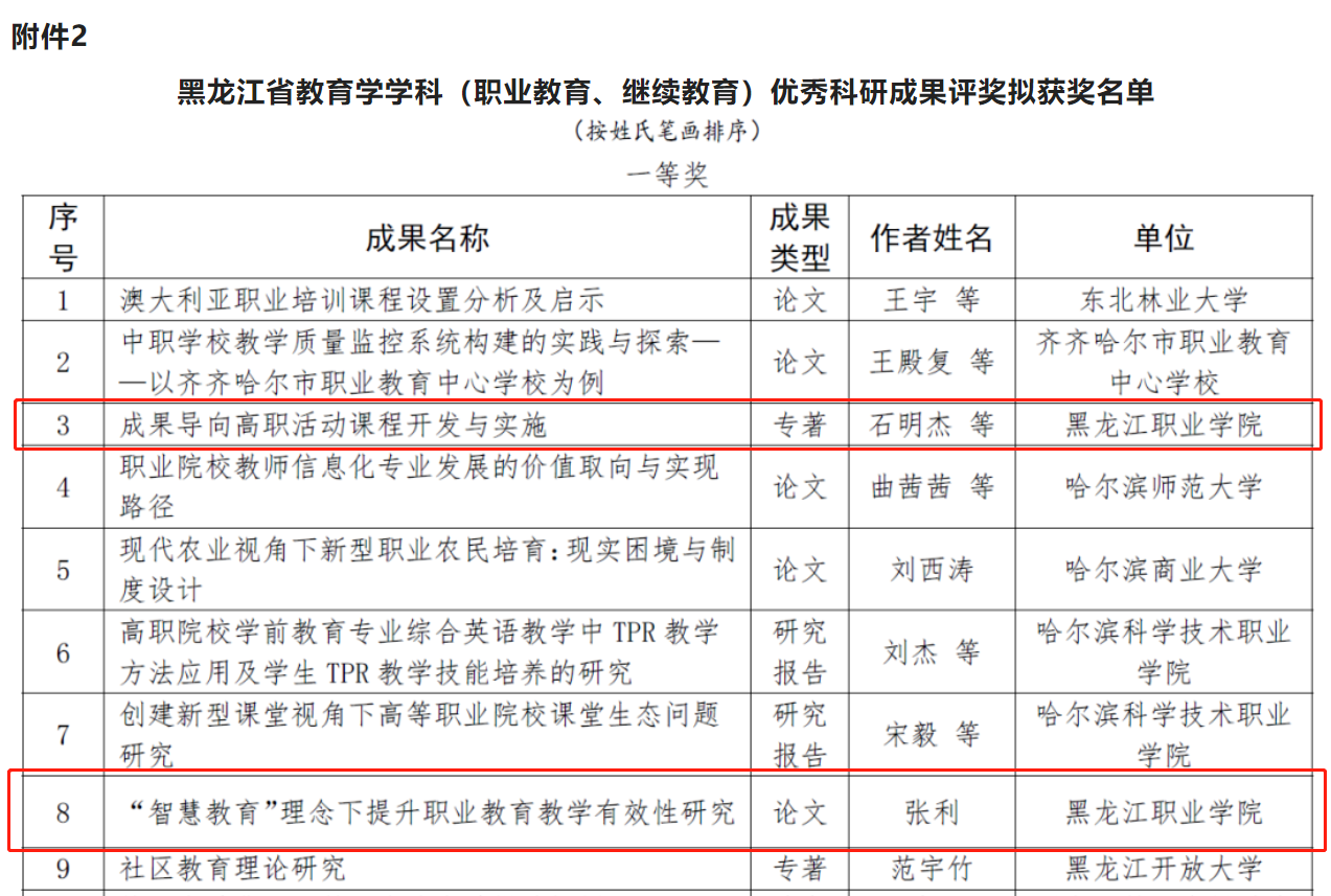三是在省社科联组织的2022年黑龙江省教育学学科优秀科研成果奖的评比中,我校共有7个项目获奖,其中一等奖2项,二等奖2项,三等奖3项。据悉该奖项是我省在哲学社会科学研究领域含金量非常高的奖项,此次也是我校在该奖项零的突破。