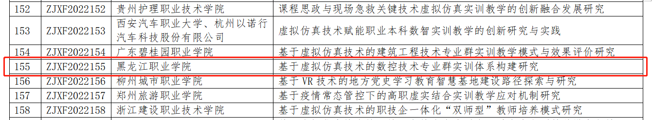 一是由我校智能制造技术学院申报的《基于虚拟仿真技术的数控技术专业群实训体系构建研究》项目,获批教育部高等学校科学研究发展中心2022年度《虚拟仿真技术在职业教育教学中的创新应用》专项课题,这也是我校首次立项获批教育部专项课题。