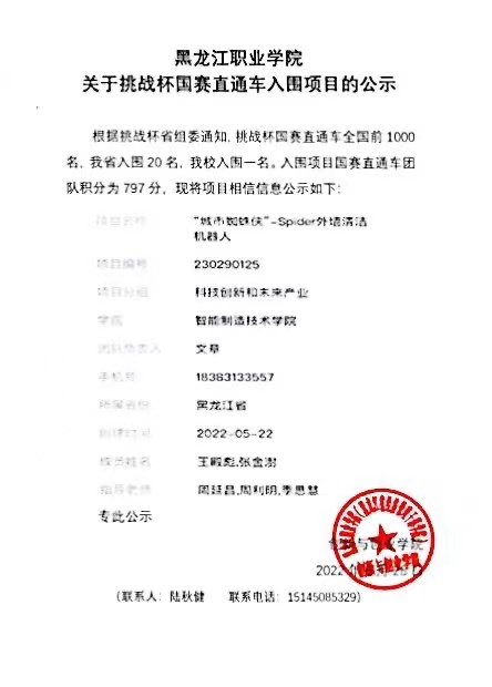 6月28日,根据第十三届工银融e联“挑战杯”黑龙江省大学生创业计划竞赛大赛省组委会通知,我校智能制造技术学院《“城市蜘蛛侠”—spider外墙清洁机器人》项目成功入围国赛直通车全国前1000名,我省共有20个项目入围,我校是全省高职院校中唯一入围项目学校。